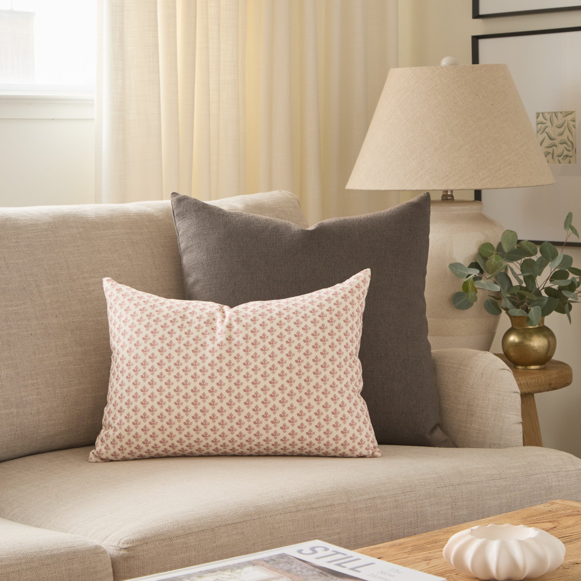 Lumbar pillows & drapery fabrics that showcase a delicate petal block print in four beautiful colours.