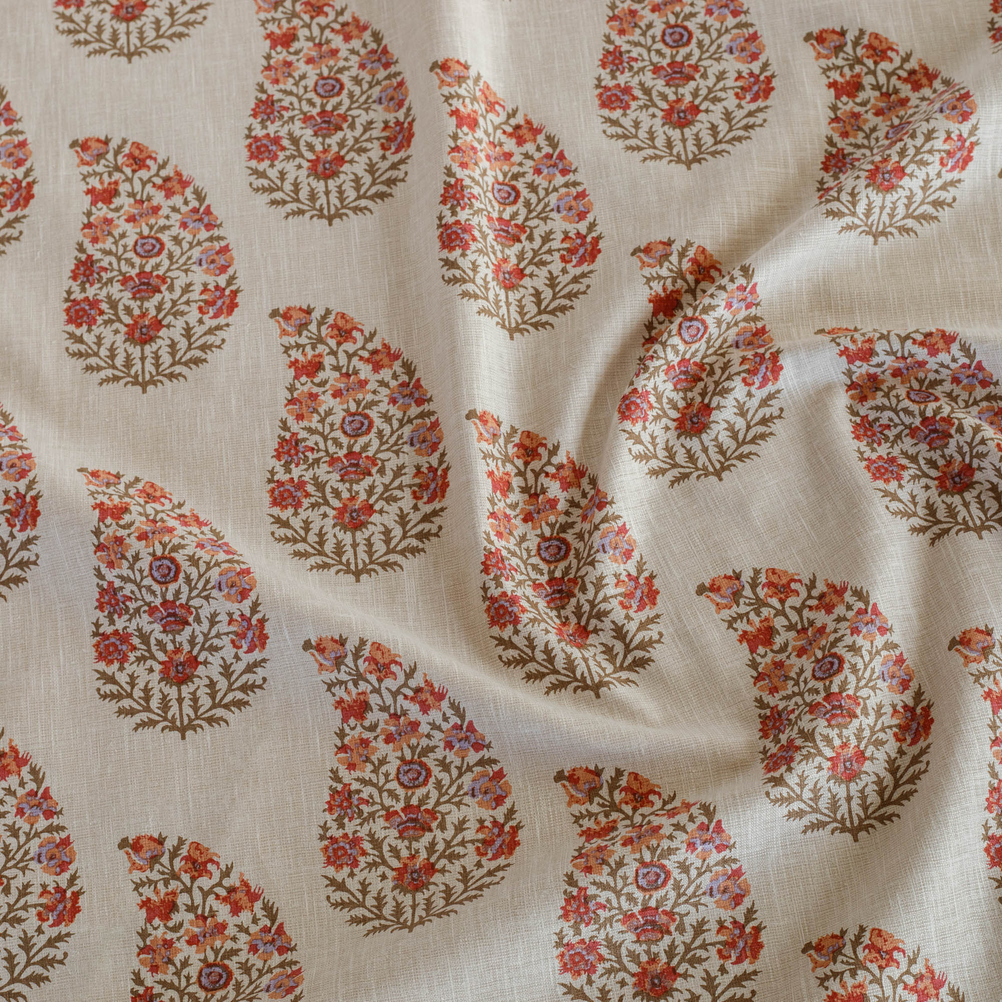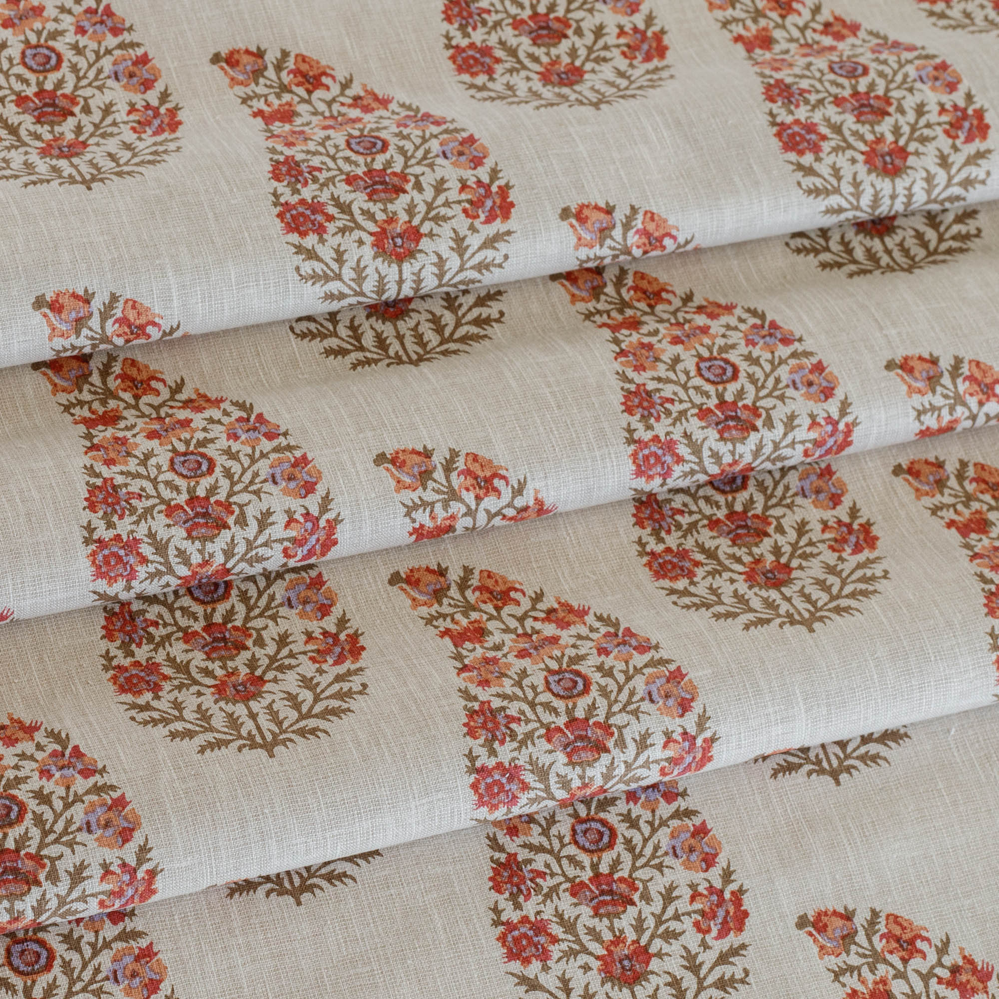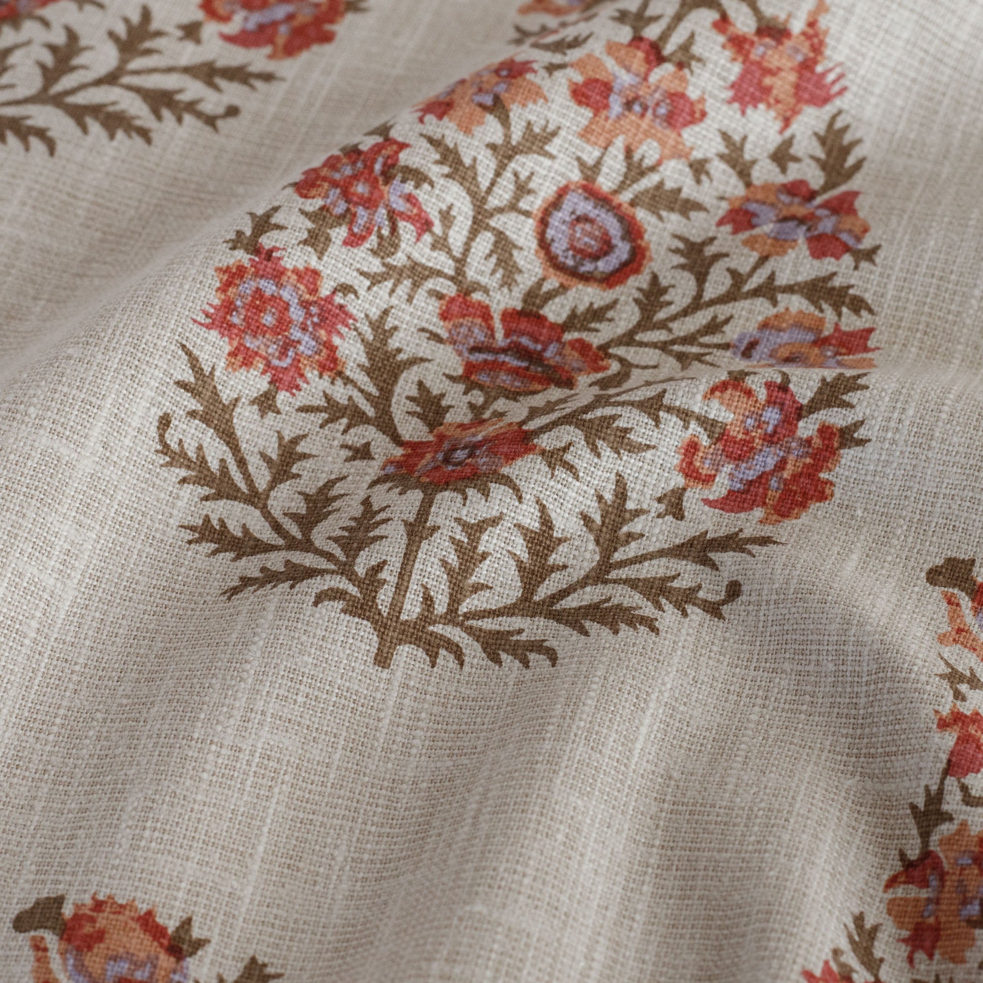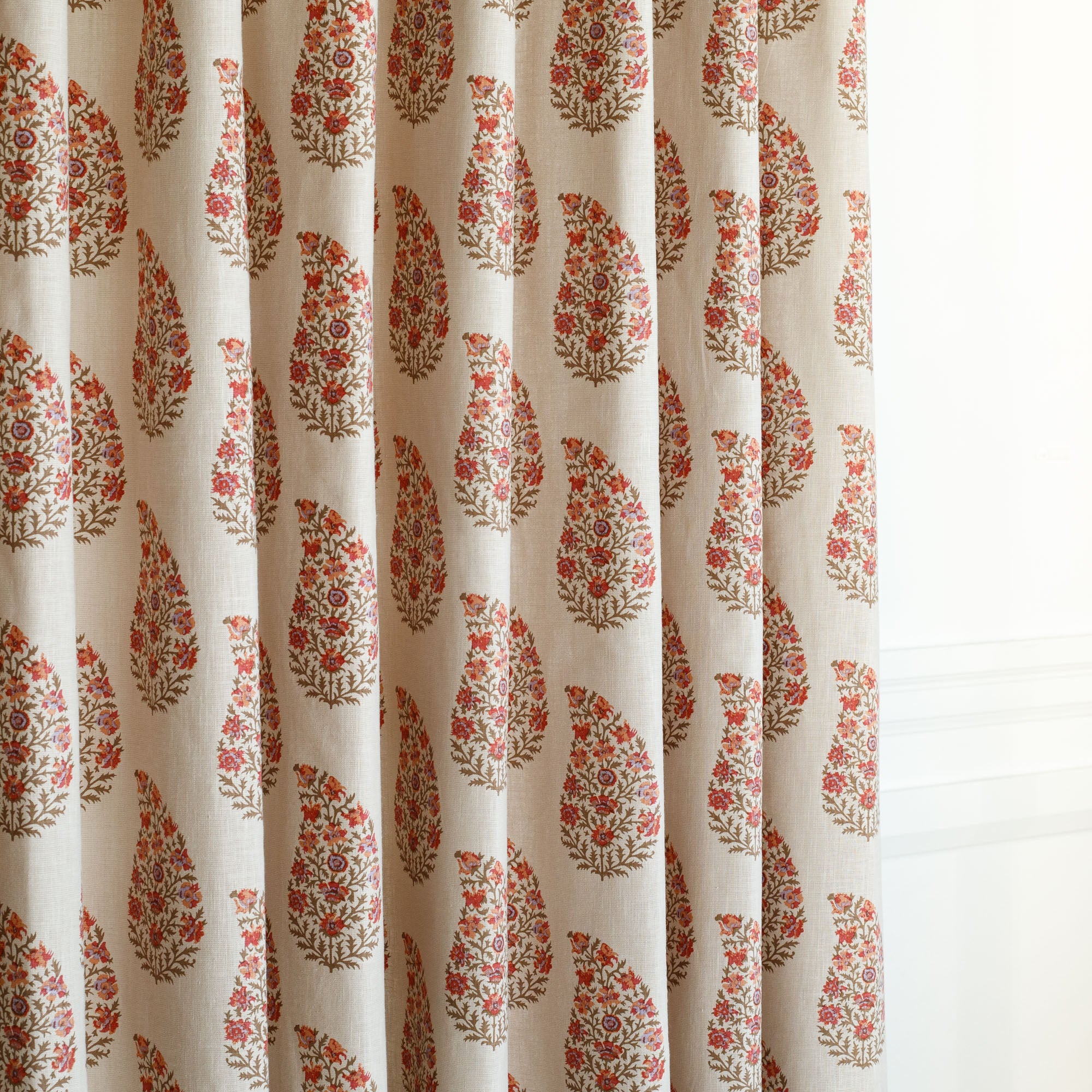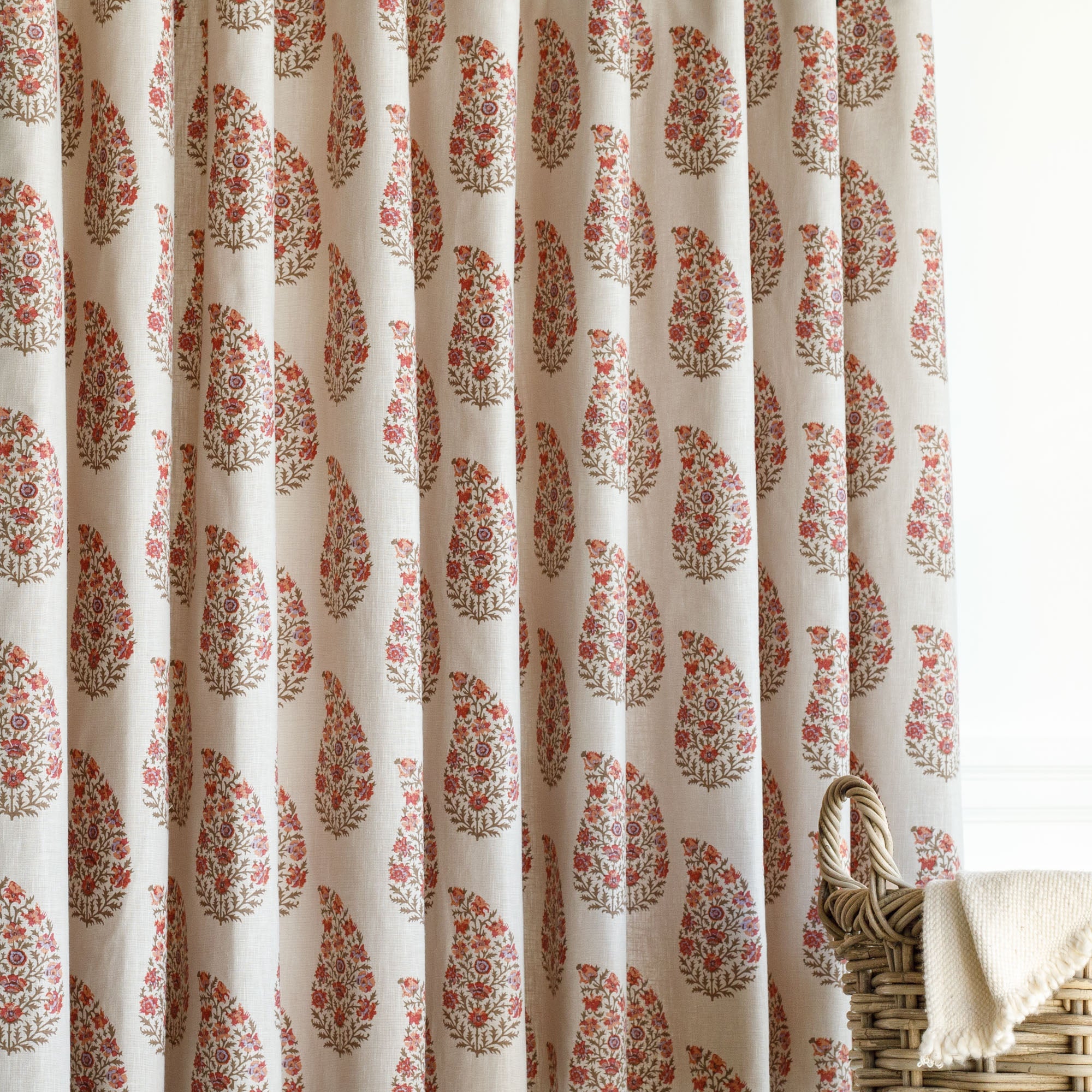Linen-blend drapery fabrics that showcase a delicate petal block print in four beautiful colours.