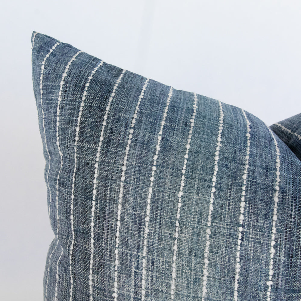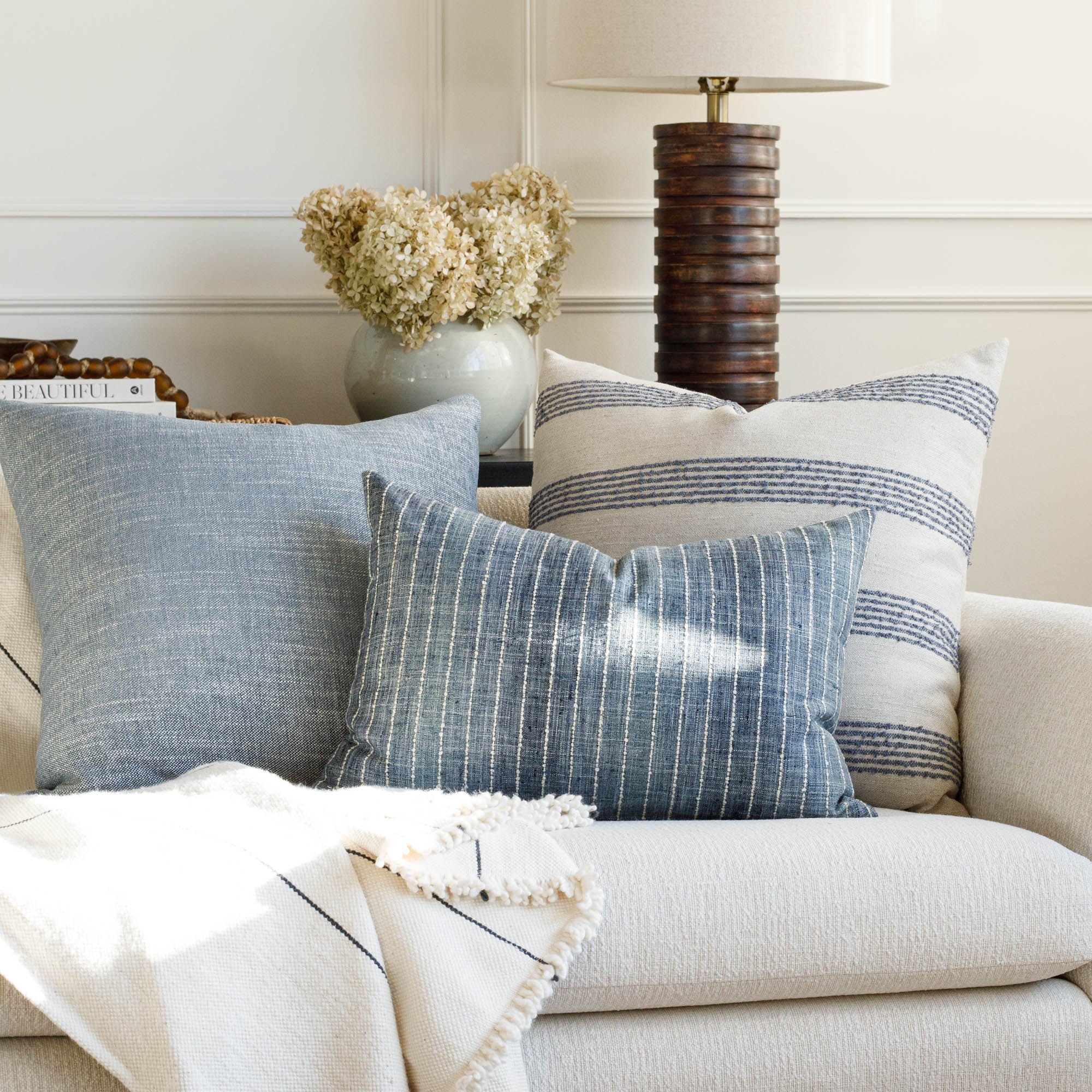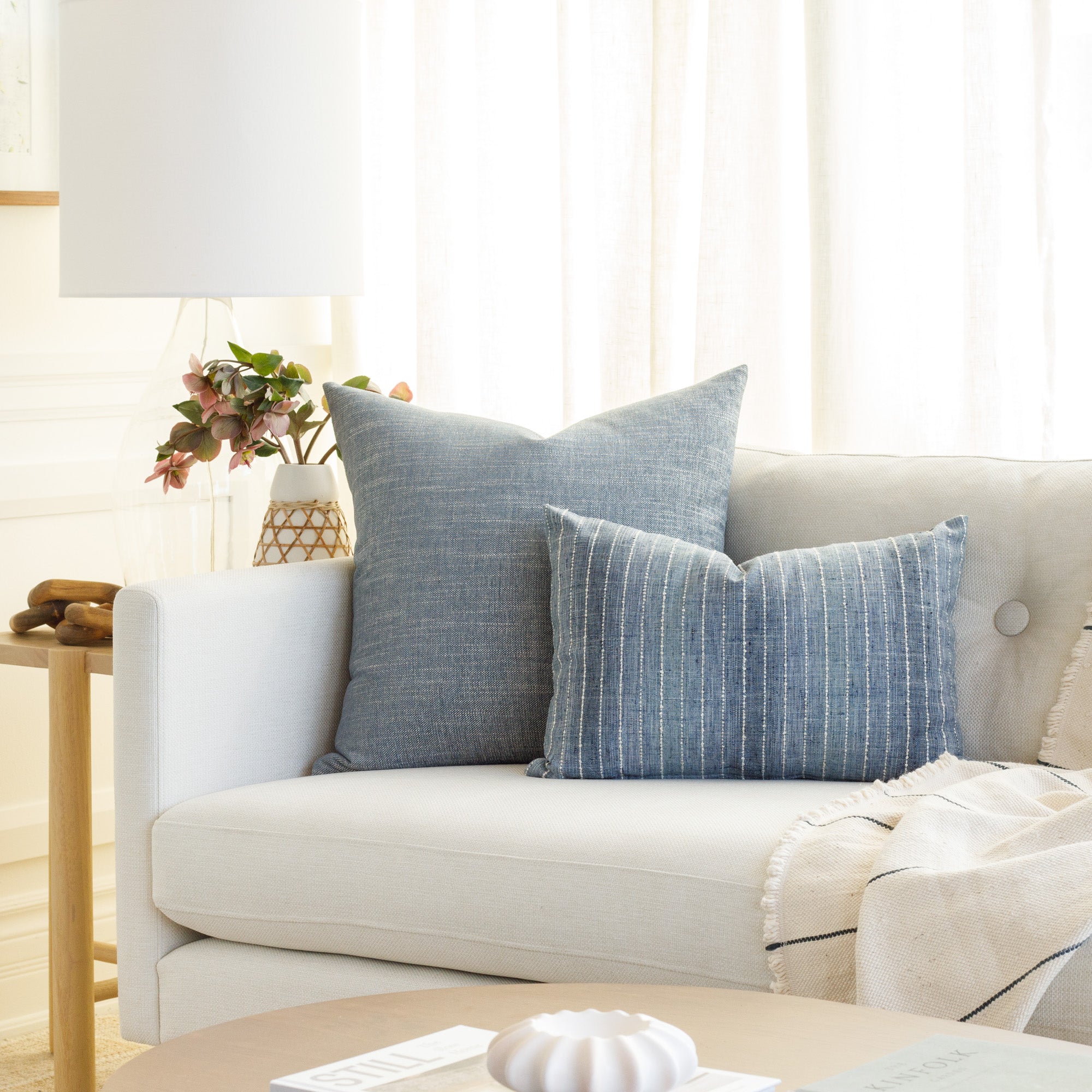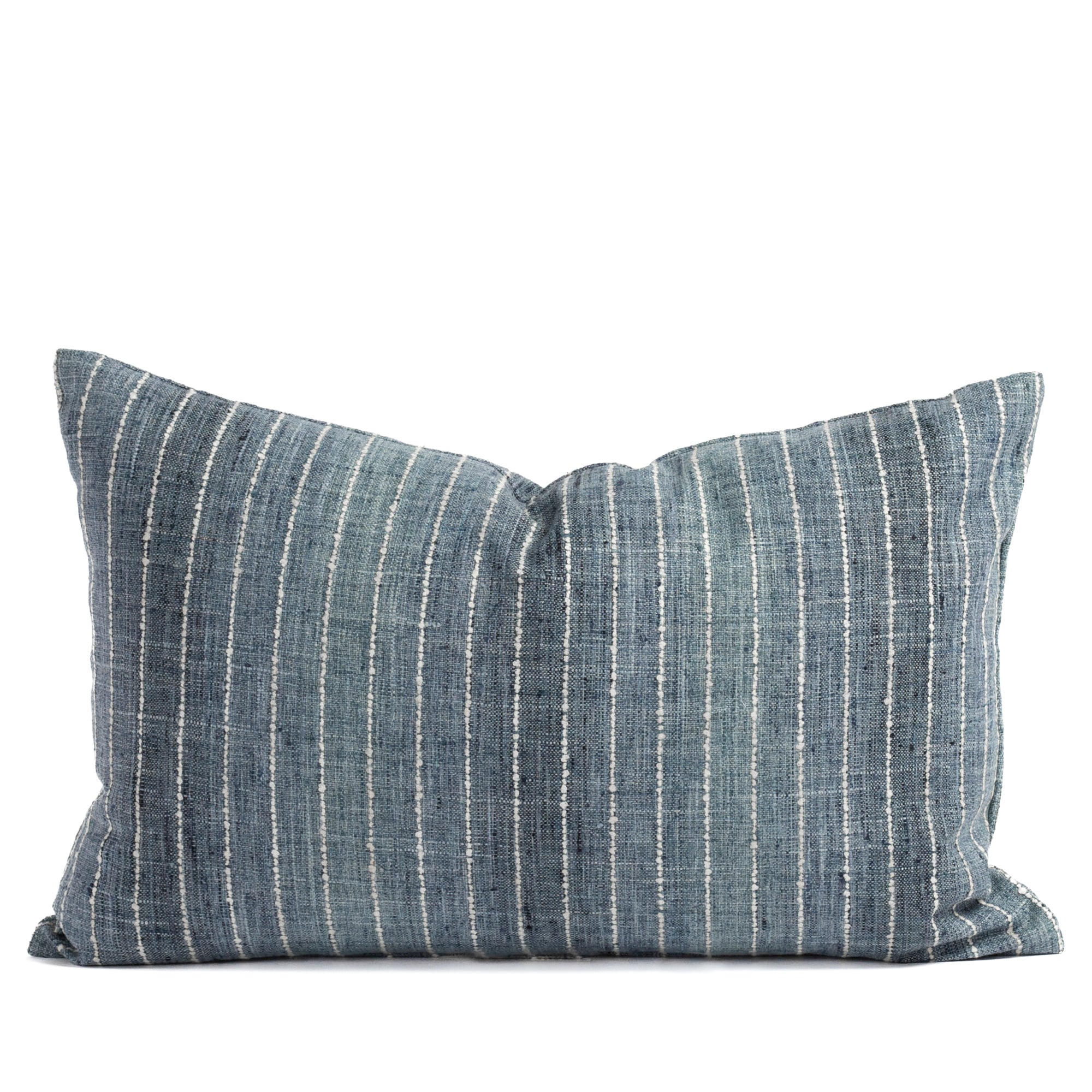This chambray blue oversized lumbar pillow features a tonal, textured stripe in a variety of beautiful blues with light accents of white. It's a versatile piece has the functional foundation of a solid with the added interest of a subtle pattern, and is sure to deliver a fresh and casual feel.
