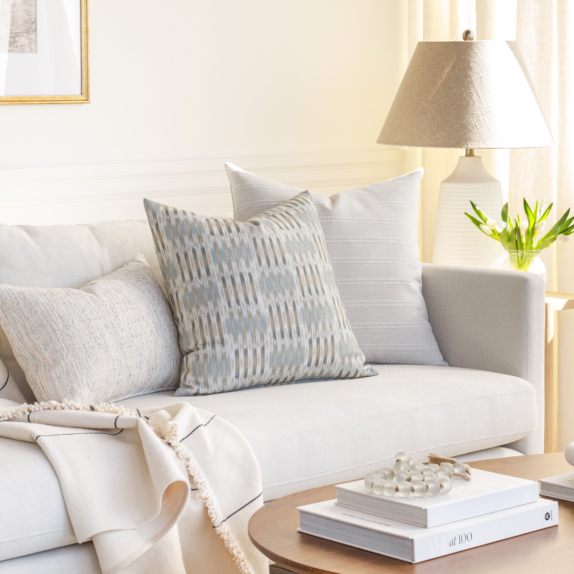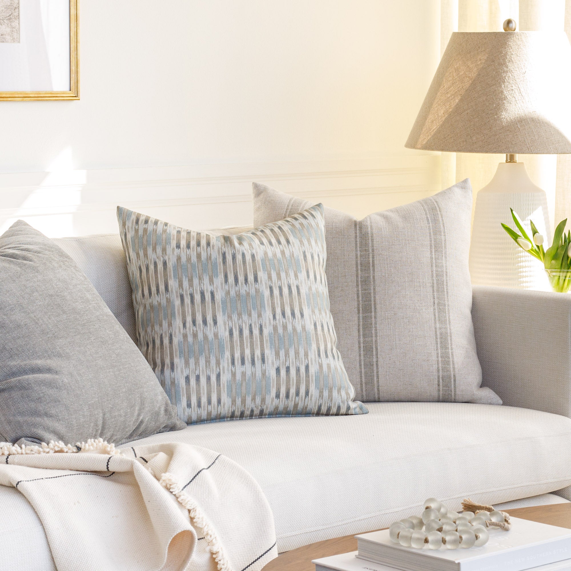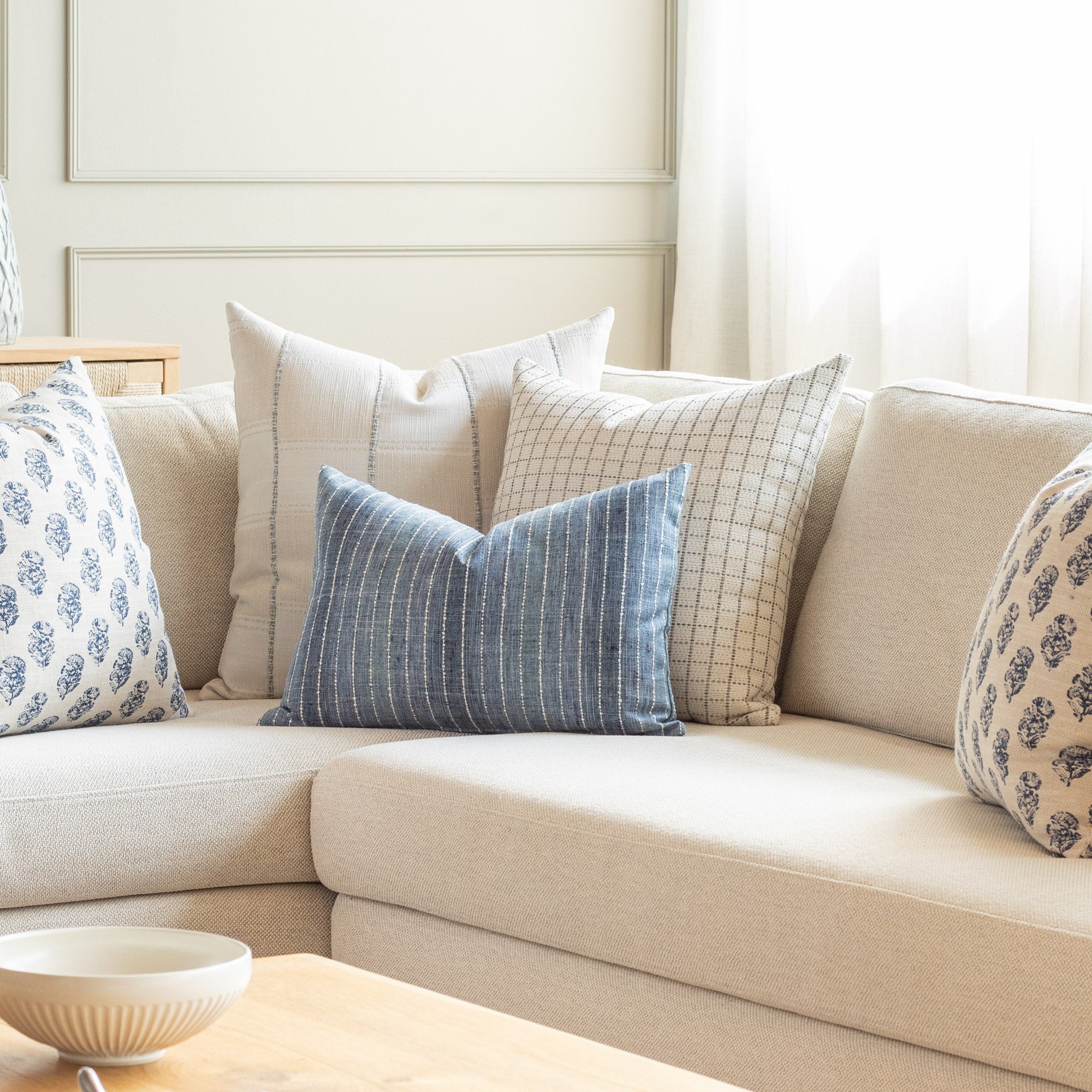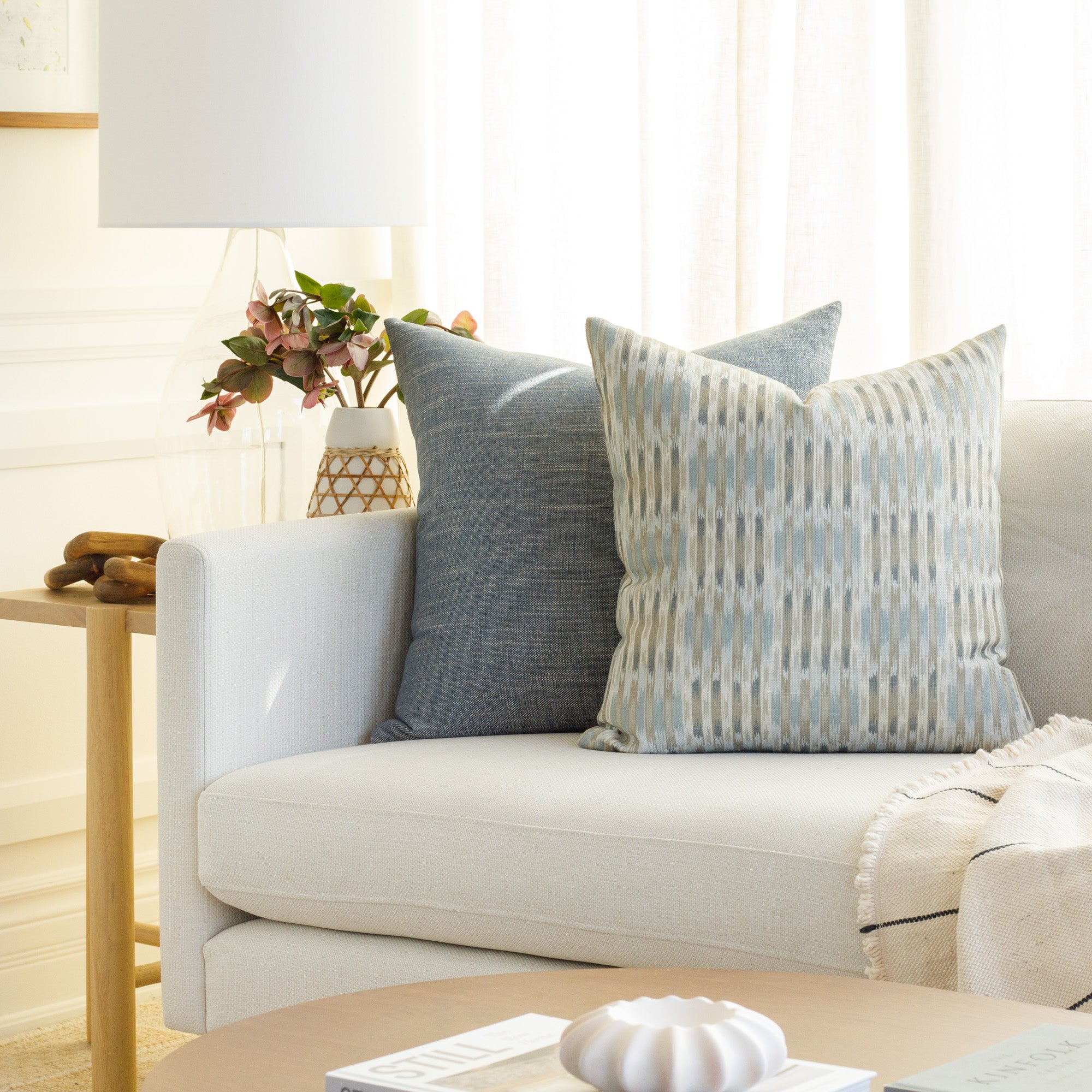 This chambray blue oversized lumbar pillow features a tonal, textured stripe in a variety of beautiful blues with light accents of white. It's a versatile piece has the functional foundation of a solid with the added interest of a subtle pattern, and is sure to deliver a fresh and casual feel.