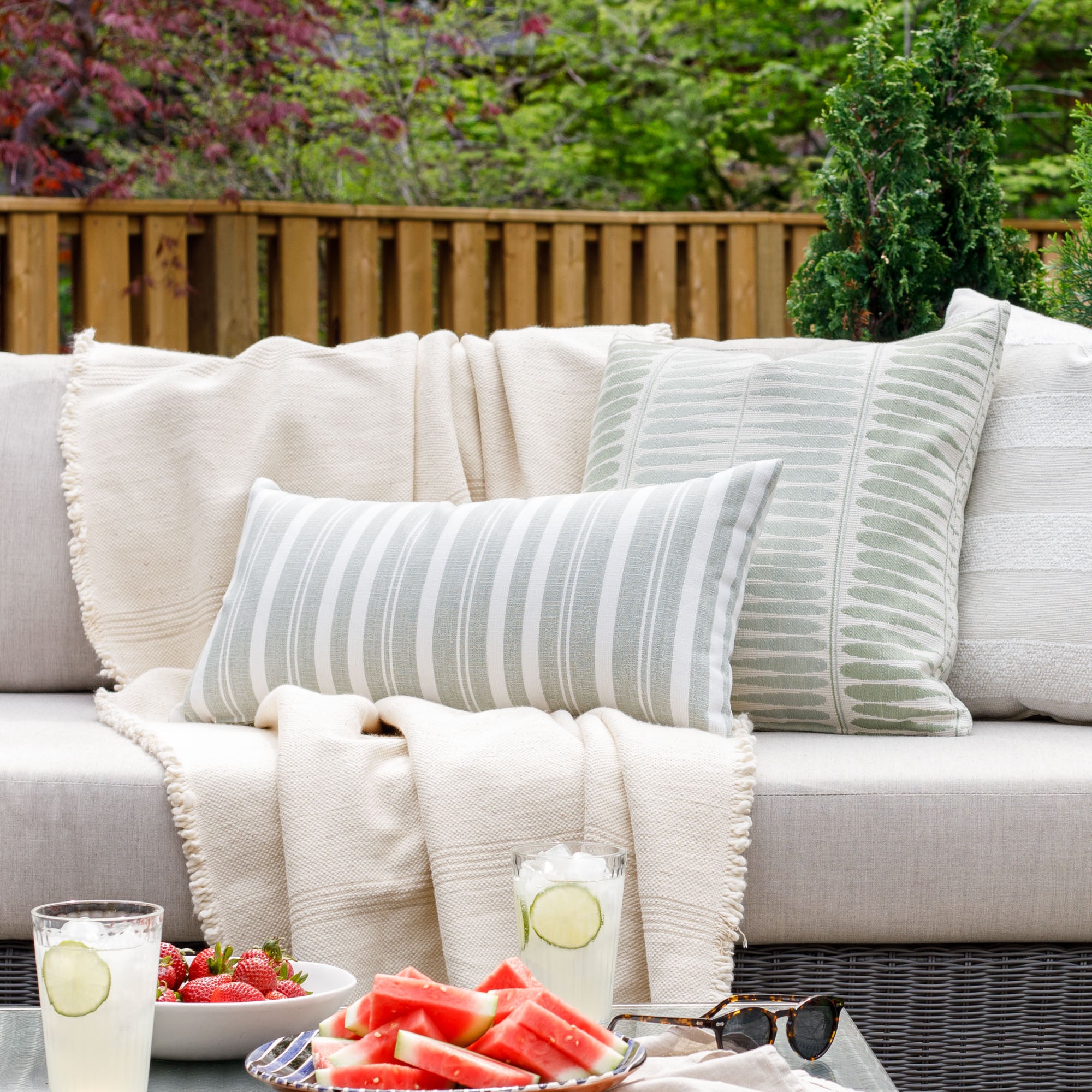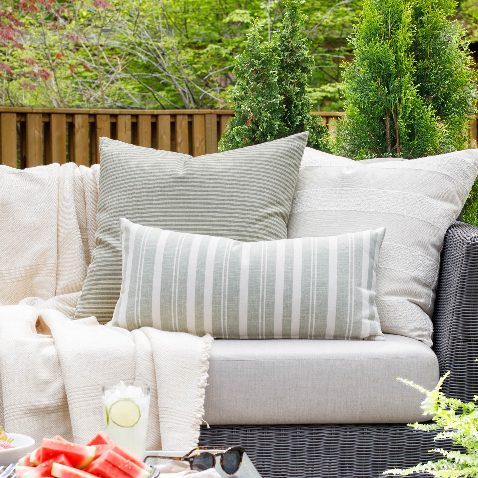 This indoor/outdoor lumbar pillow offers a fresh take on a classic stripe, with delicate woven running stitches that add a tailored touch.