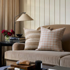 This nutty brown pillow showcases bouclé stripes, offering a cozy, textural feel.