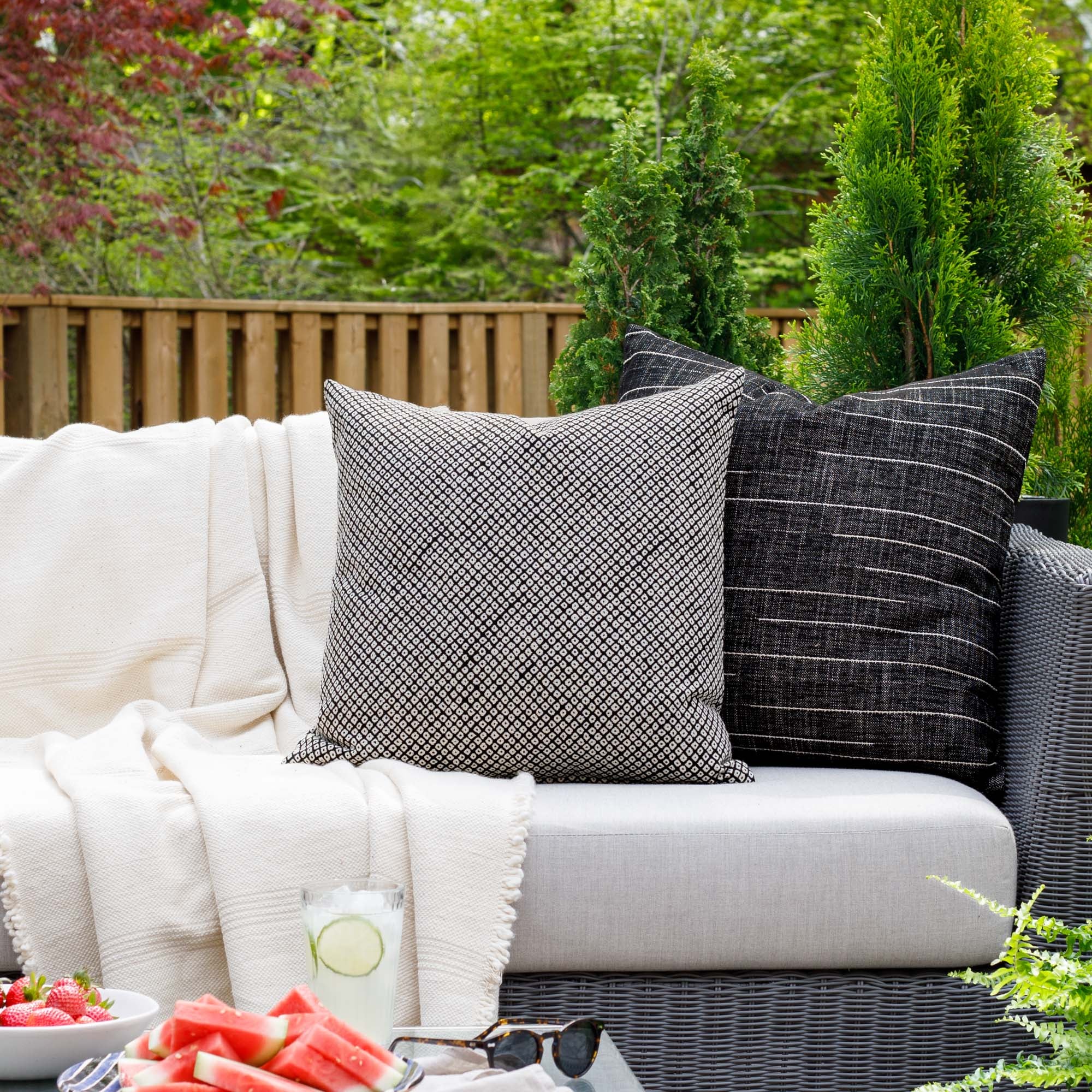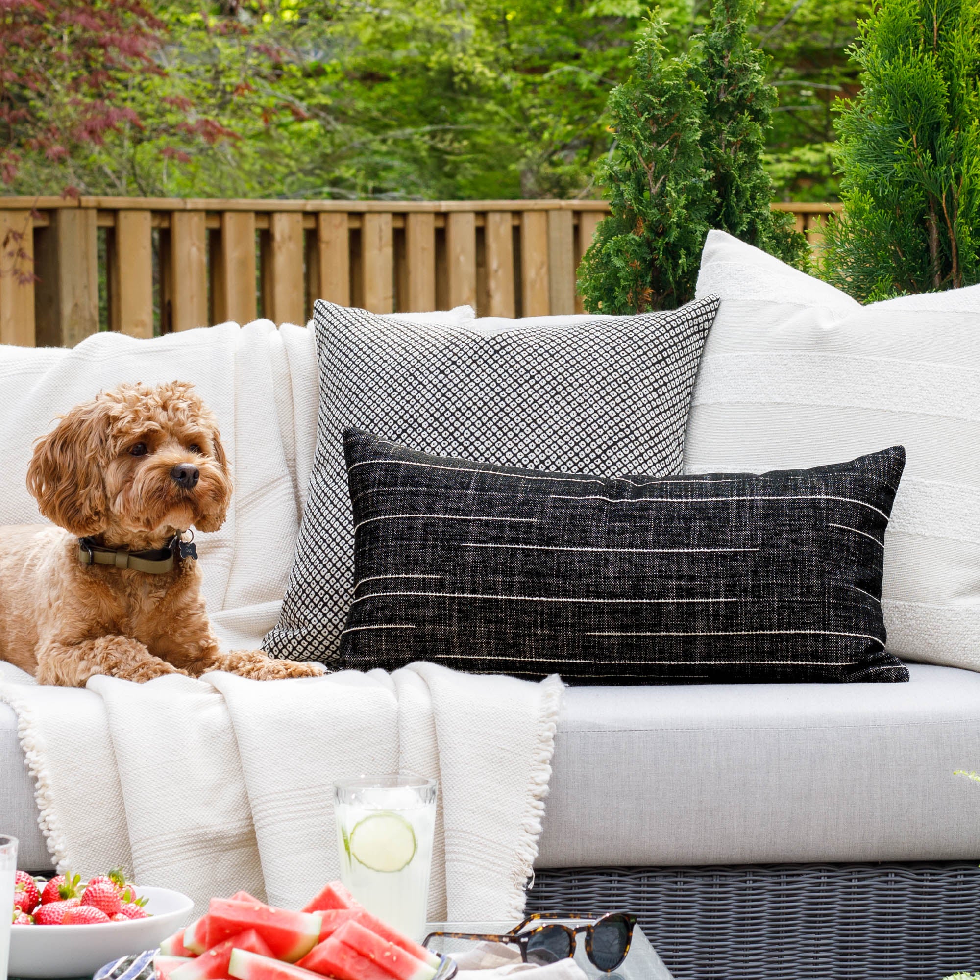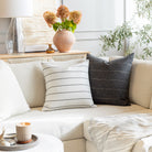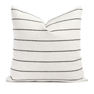 A textured, creamy white pillow with horizontal black stripes in a thin stitched line. A top selling pillow that mixes in with any style of pillow-scape.