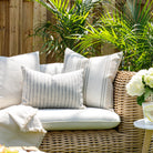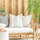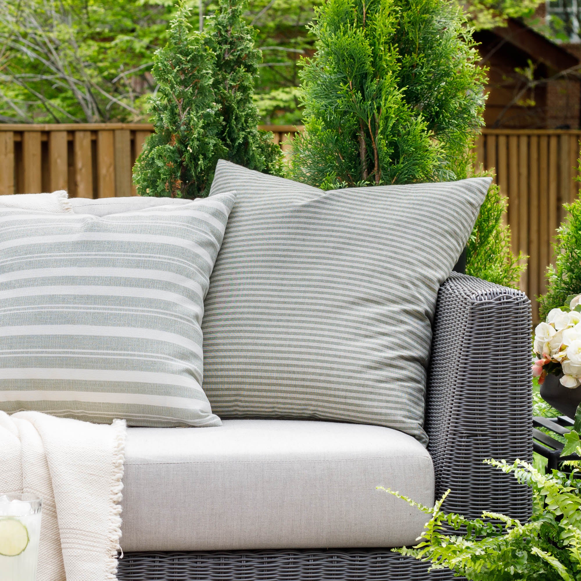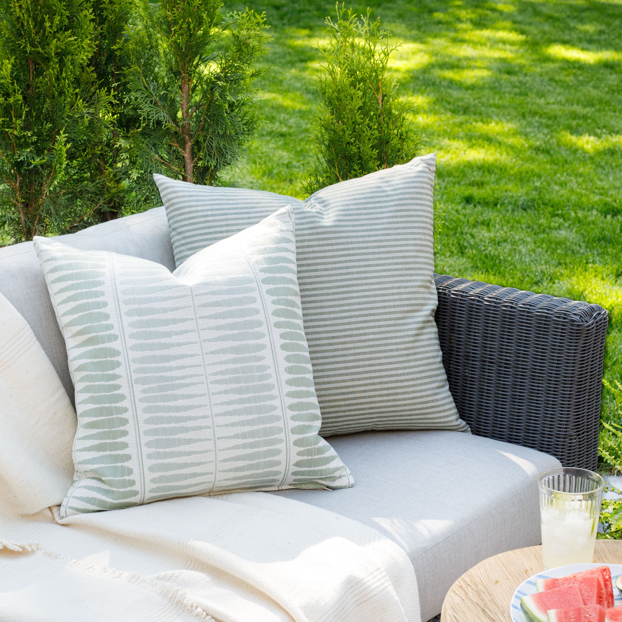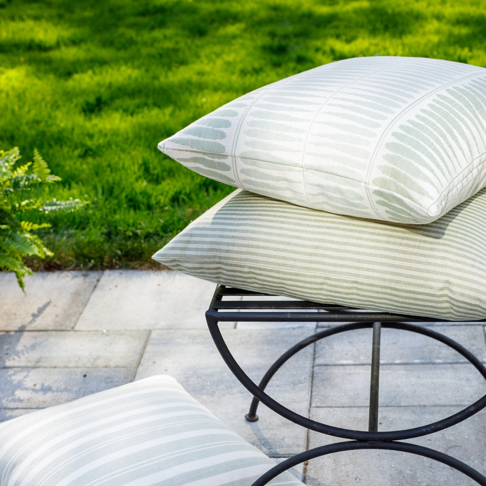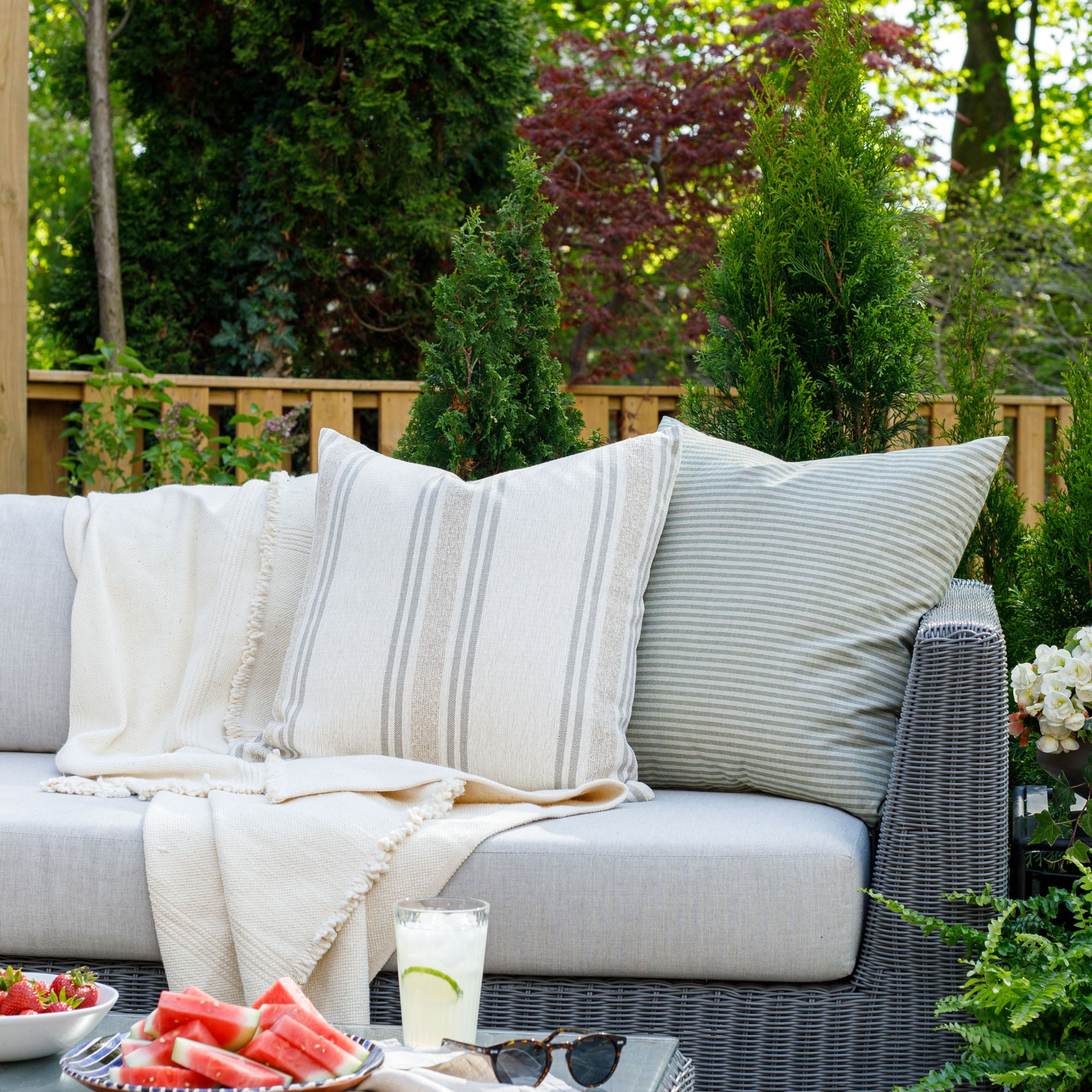 This stunning indoor/outdoor pillow features a variegated awning stripe in tones of white, cream, and sandy taupe. With a beautiful, weighty weave and texture, this versatile pillow is an instant classic and will add a hit of graphic pattern to your outdoor or indoor seating.