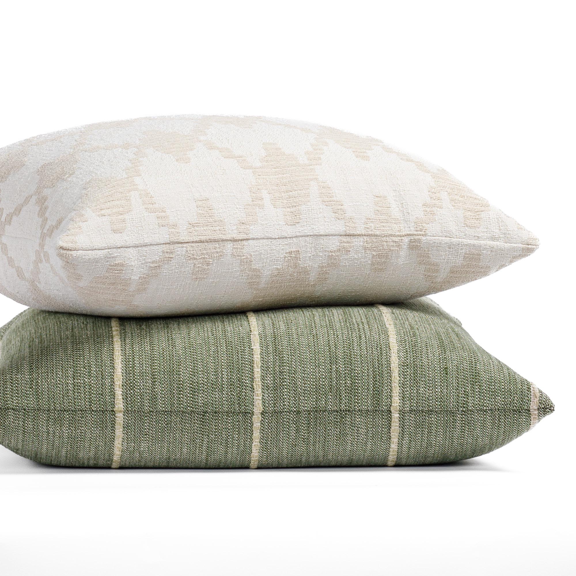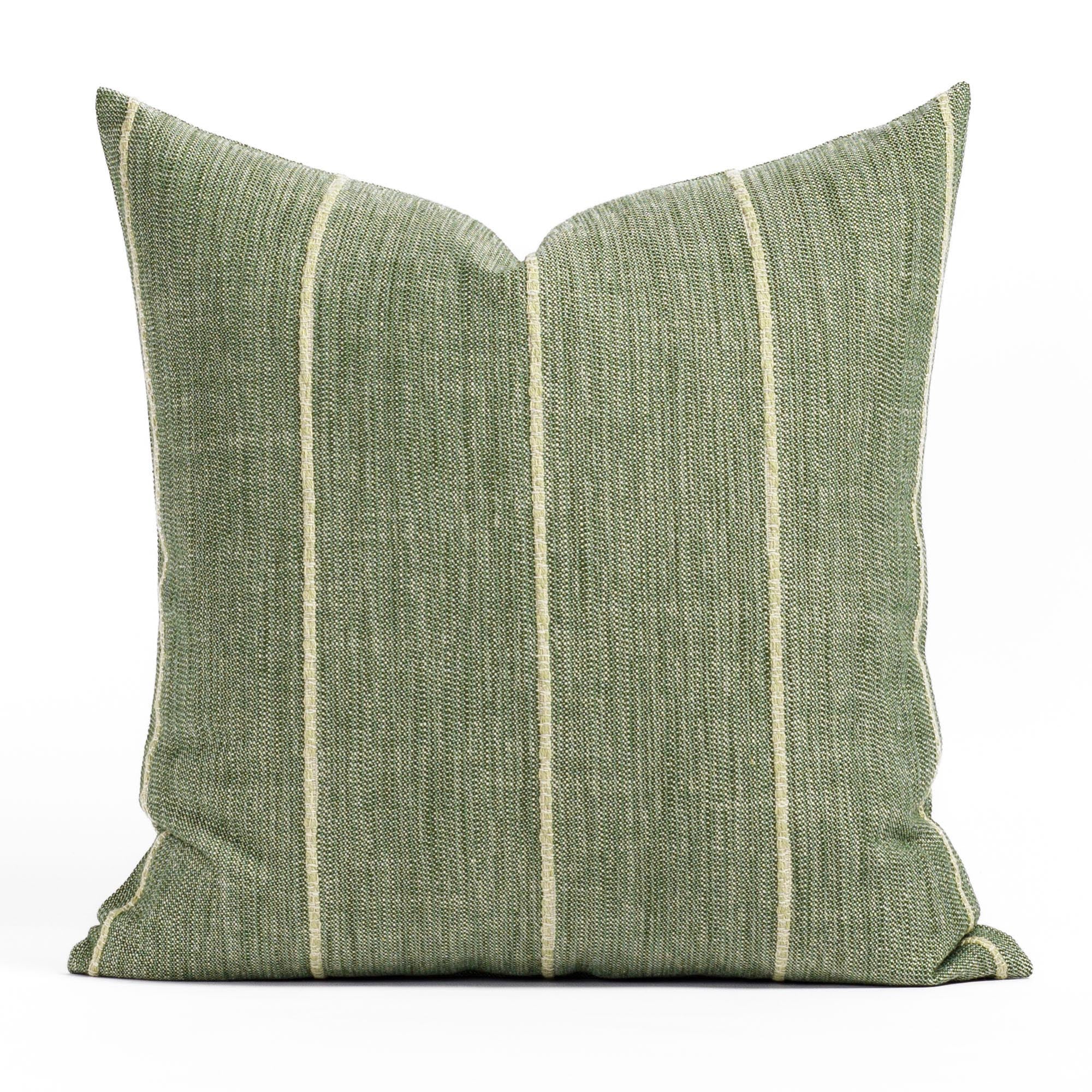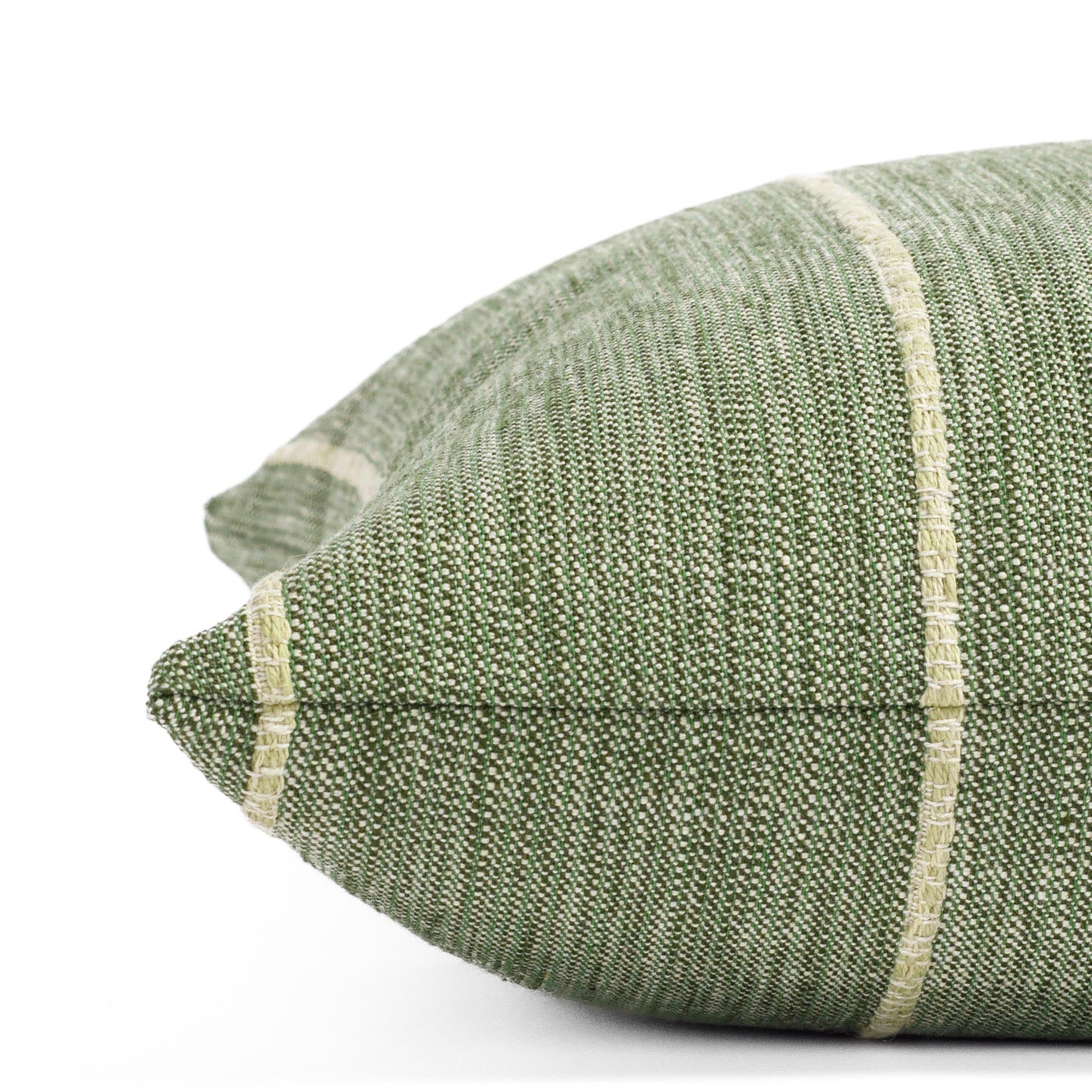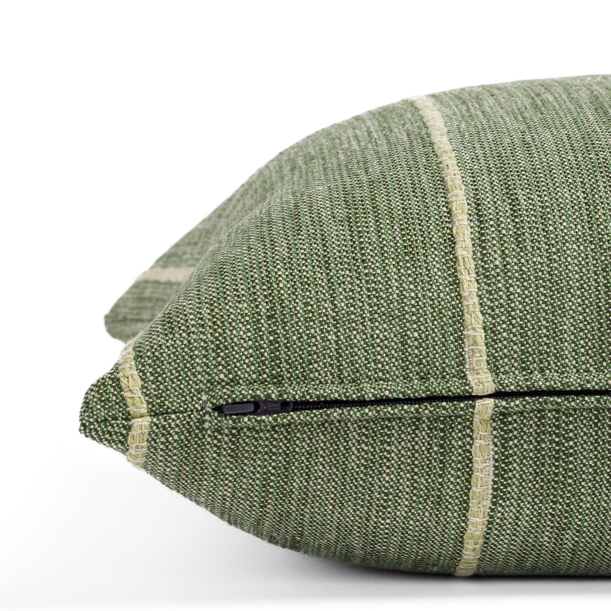This leaf green indoor/outdoor pillow features a dynamic broken stripe pattern with textured woven lines. The design brings an earthy, contemporary feel with subtle movement and interest.