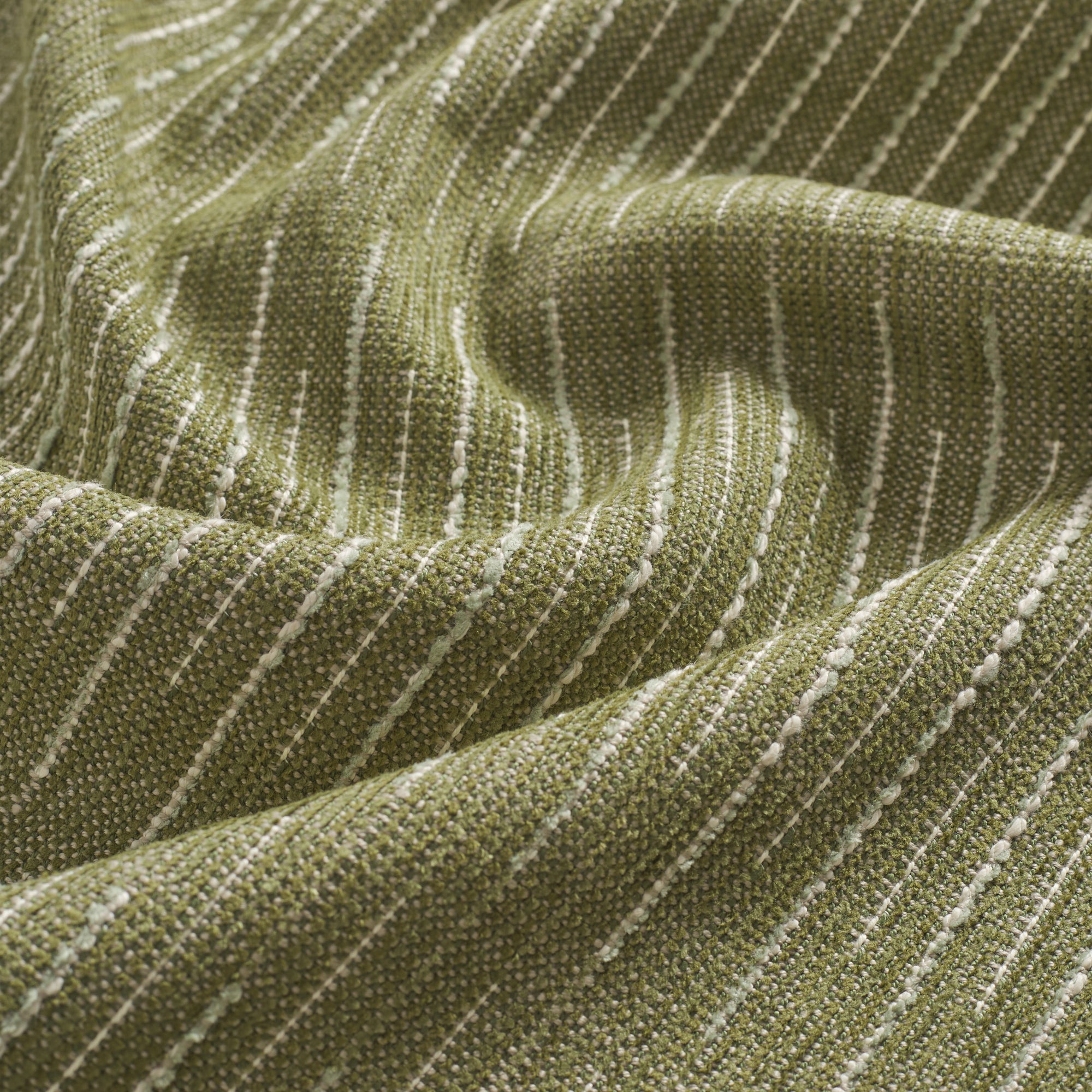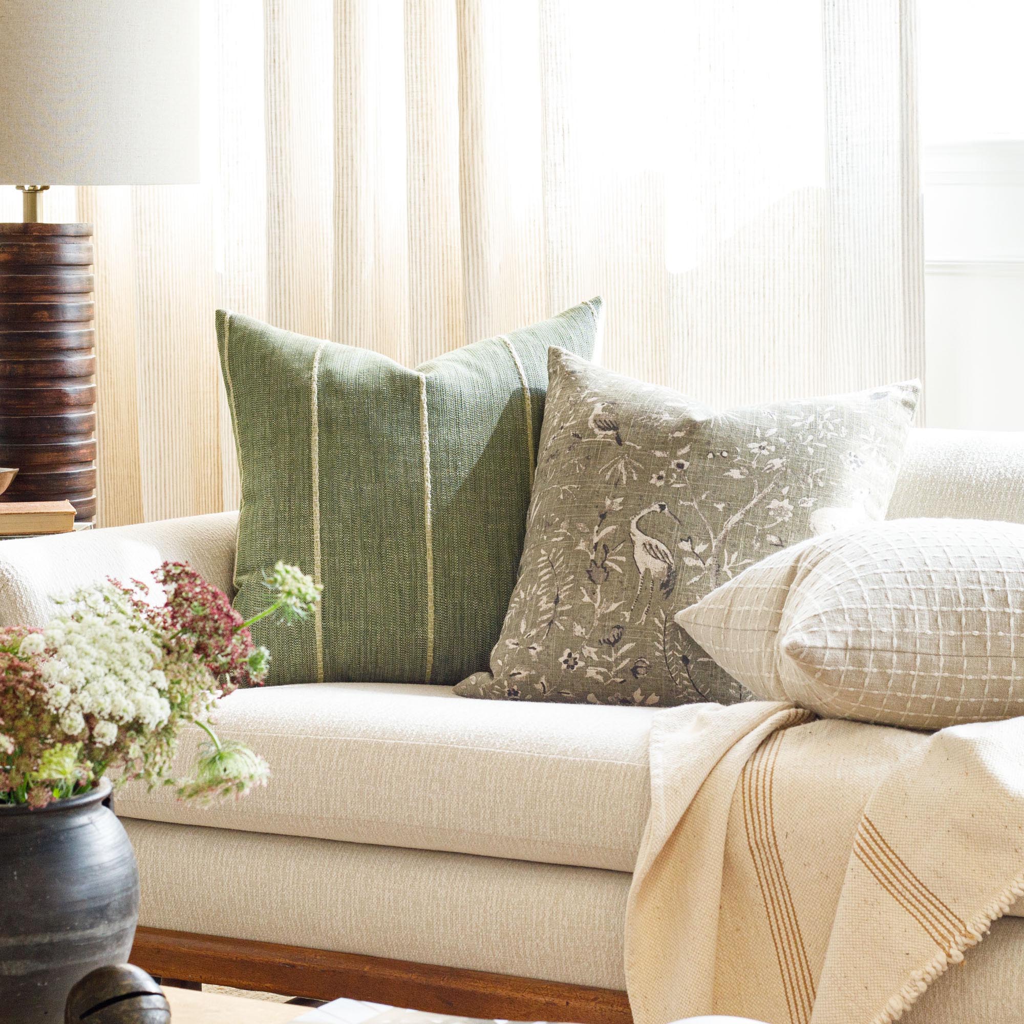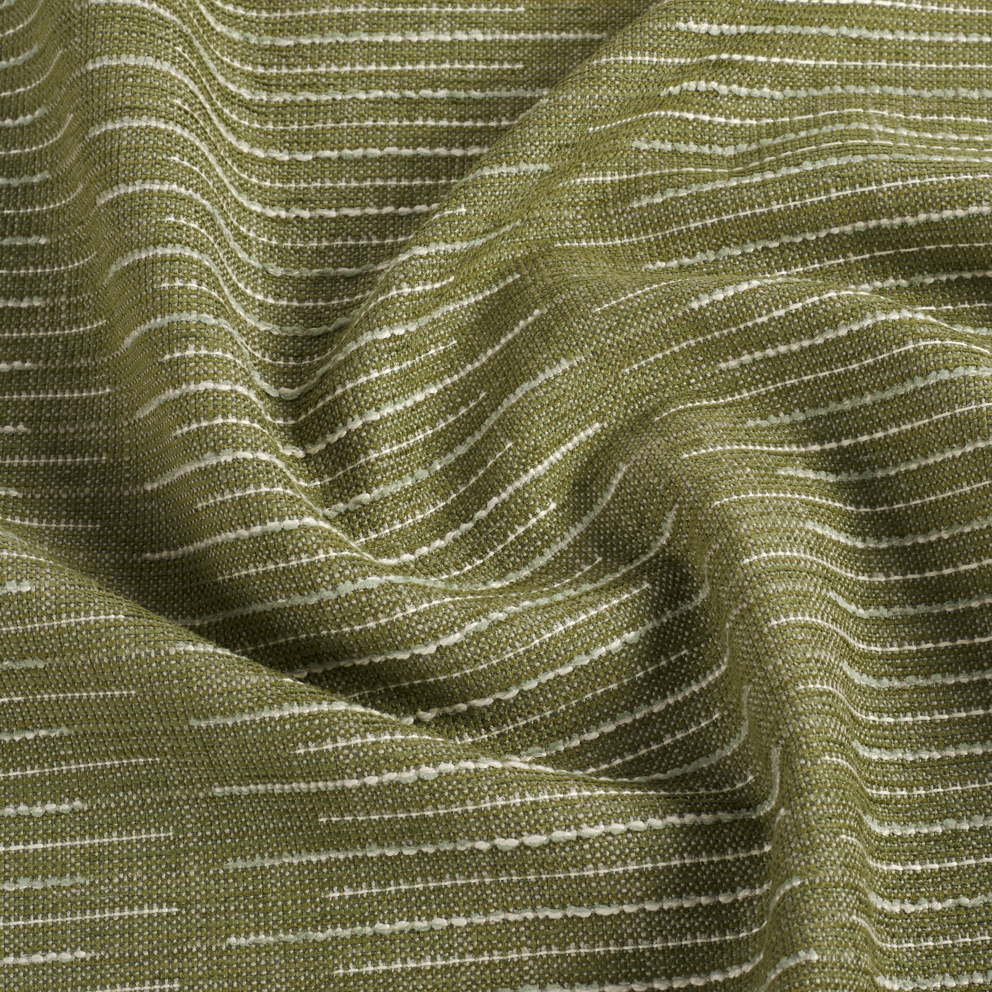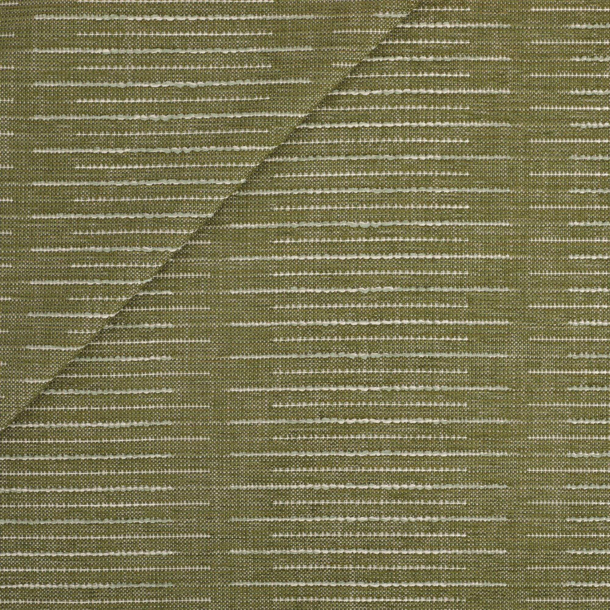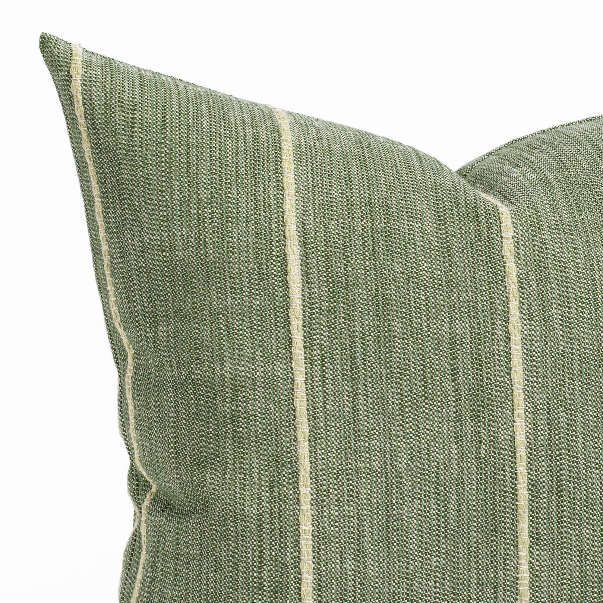 This leaf green indoor/outdoor pillow features a dynamic broken stripe pattern with textured woven lines. The design brings an earthy, contemporary feel with subtle movement and interest.