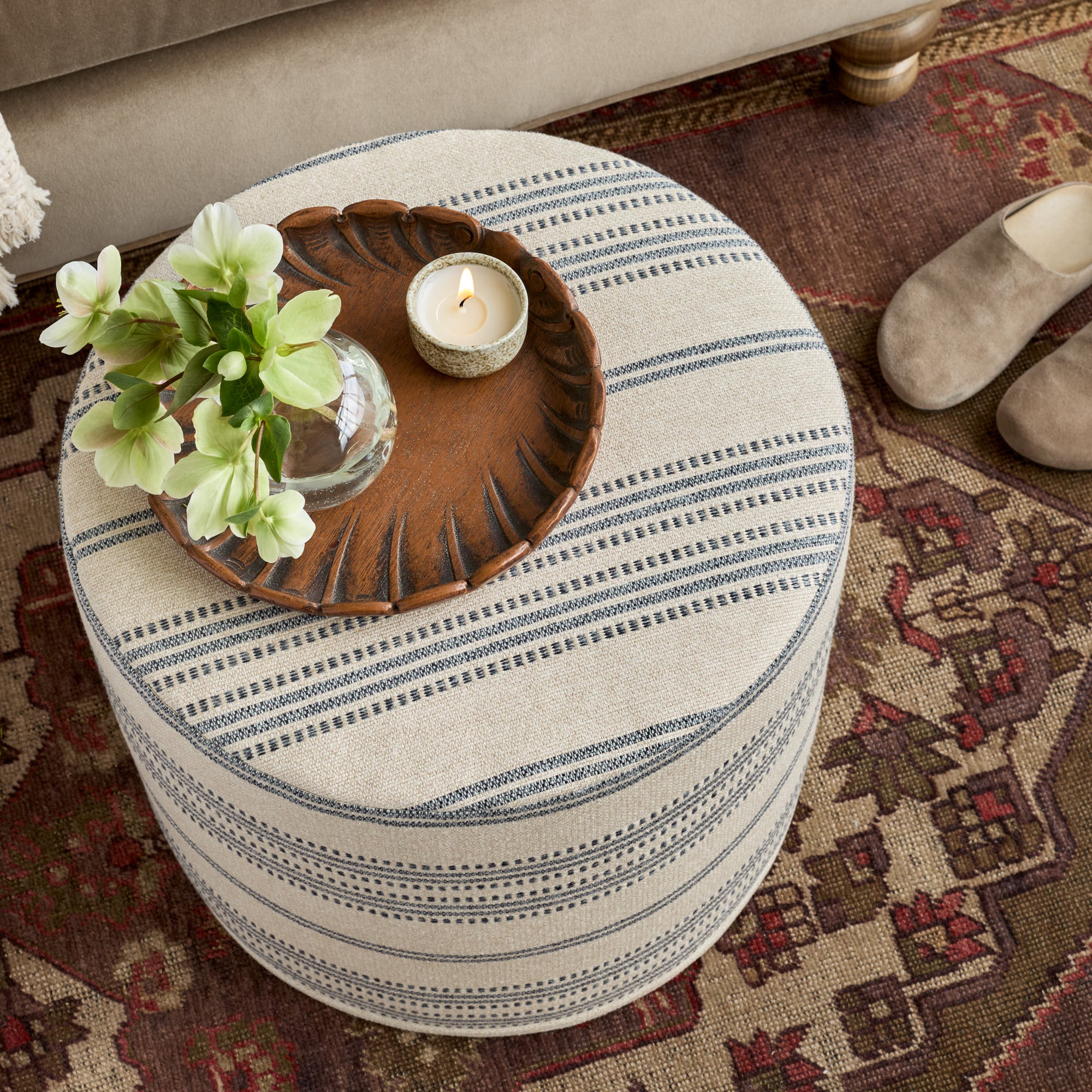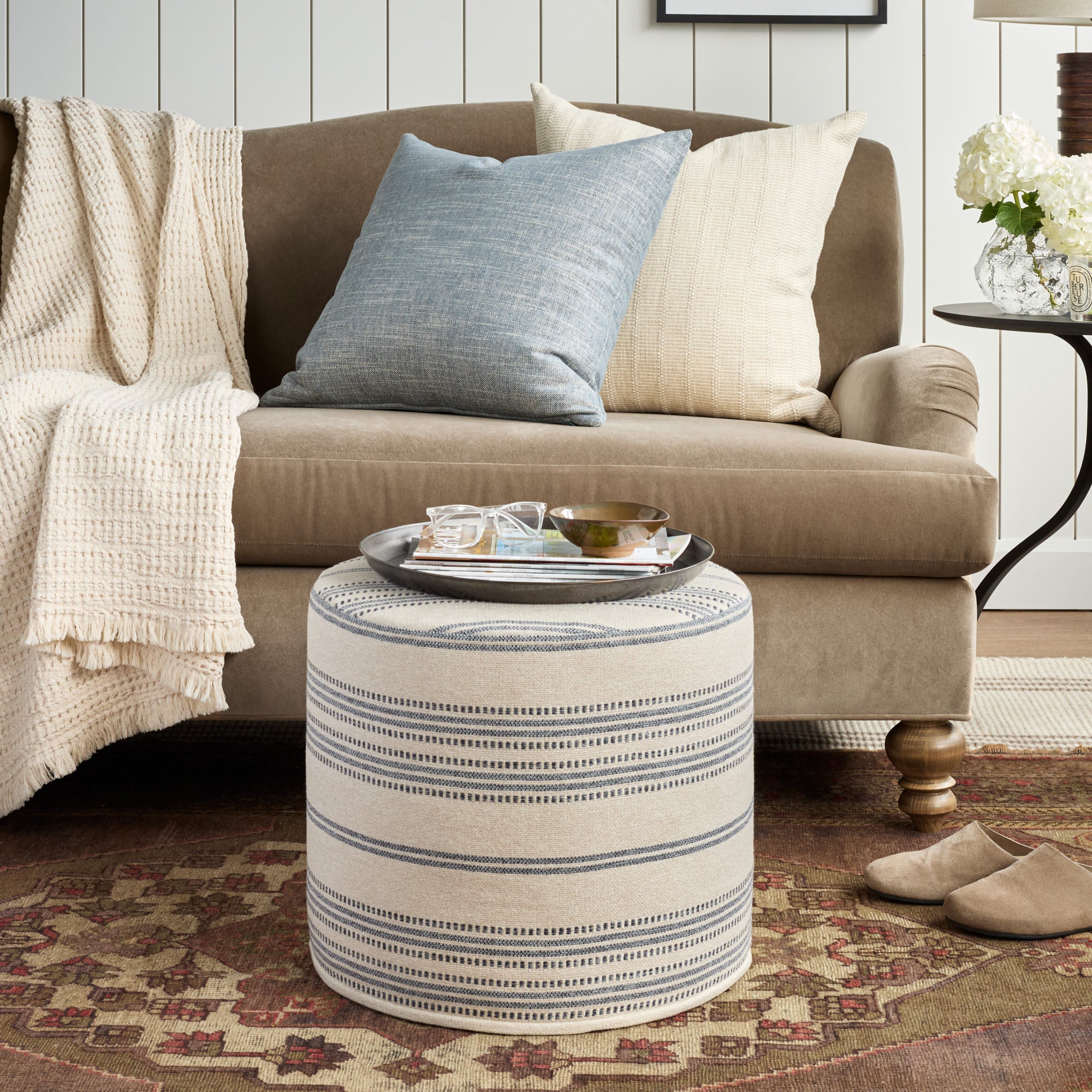This blue and tan striped pillow features layered bands with dotted stitch accents. The mix of stripe elements offers a fresh take on a classic pattern.