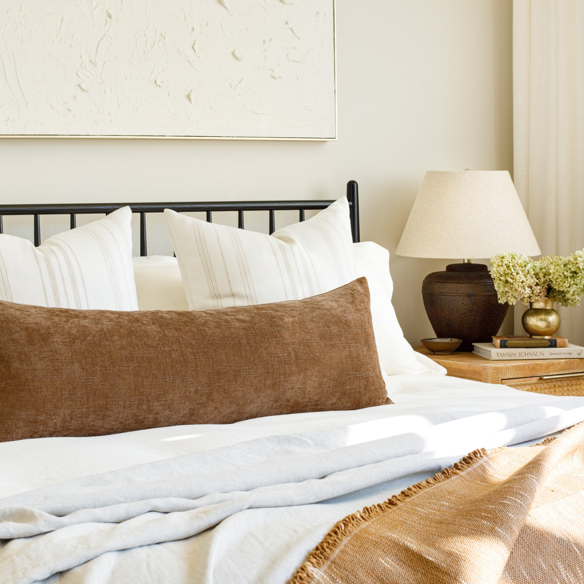 How to use it: We created these large bolsters to work perfectly on beds - especially Queens and Kings. Use one on its own for a minimal and simple bed-pillow scenario, or add different sizes behind or in front for a more layered look (They are also a fantastic body pillow size). Think beyond the bed and display one on an entry bench, kitchen banquette or in the middle of a large sofa.