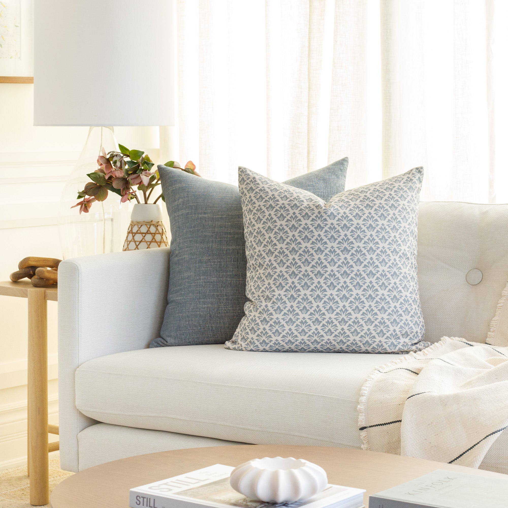 This beige and blue woven chenille pillow has an elegant diamond pattern that radiates timeless style.