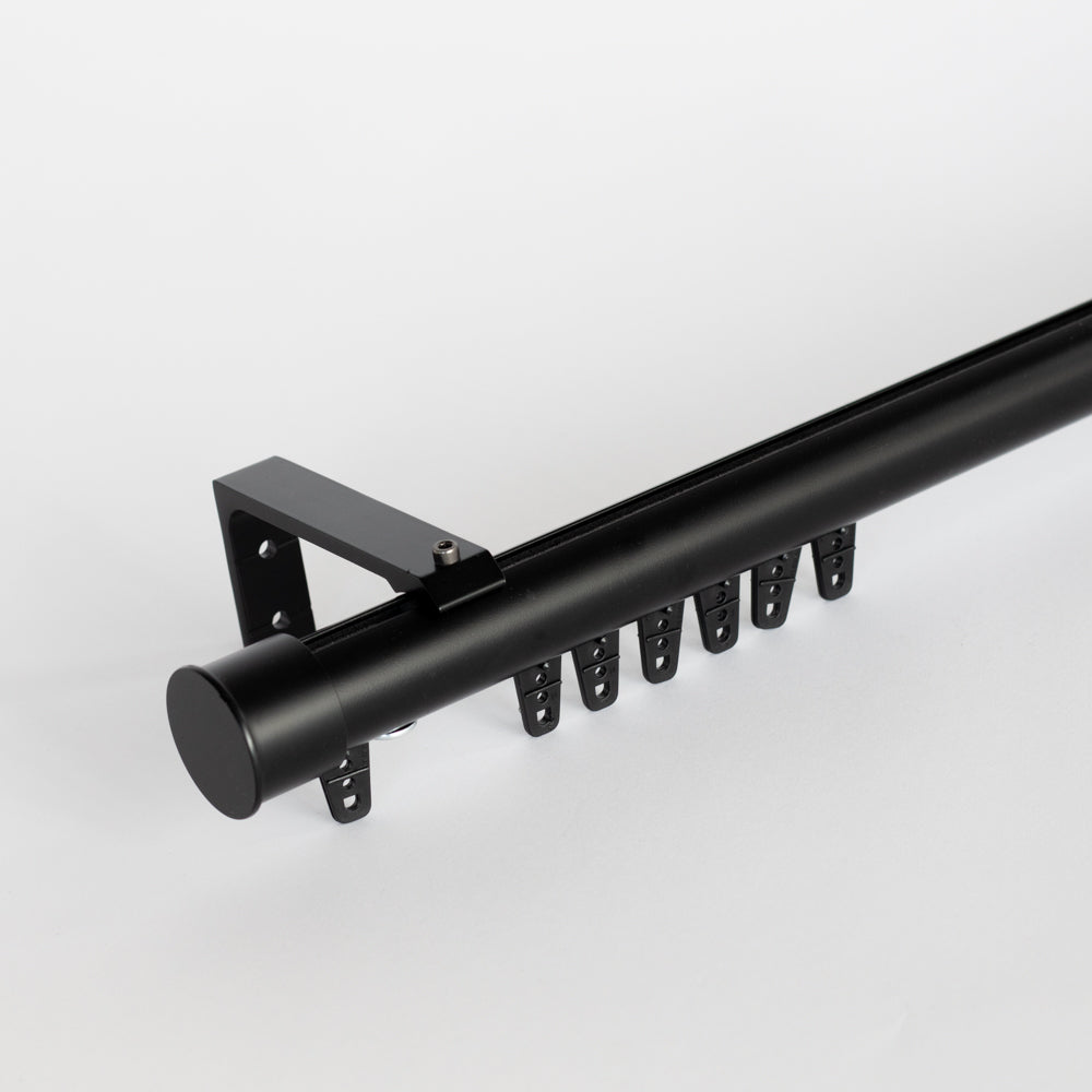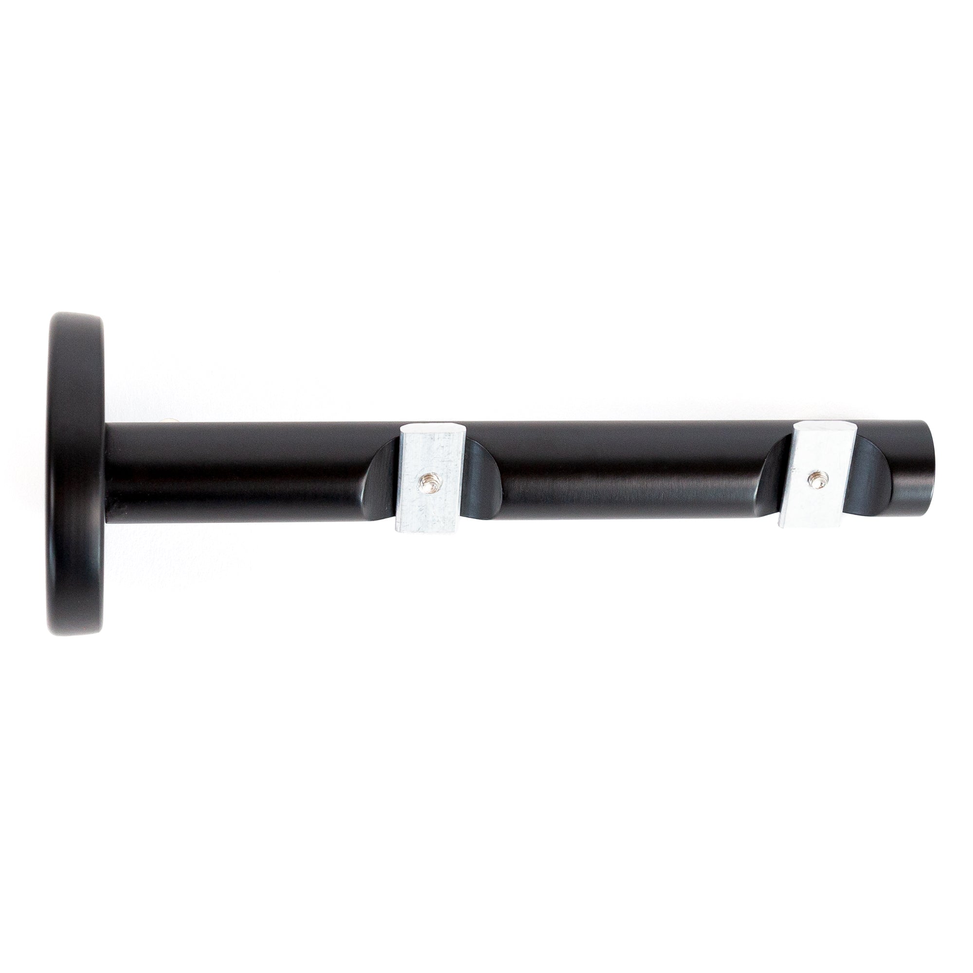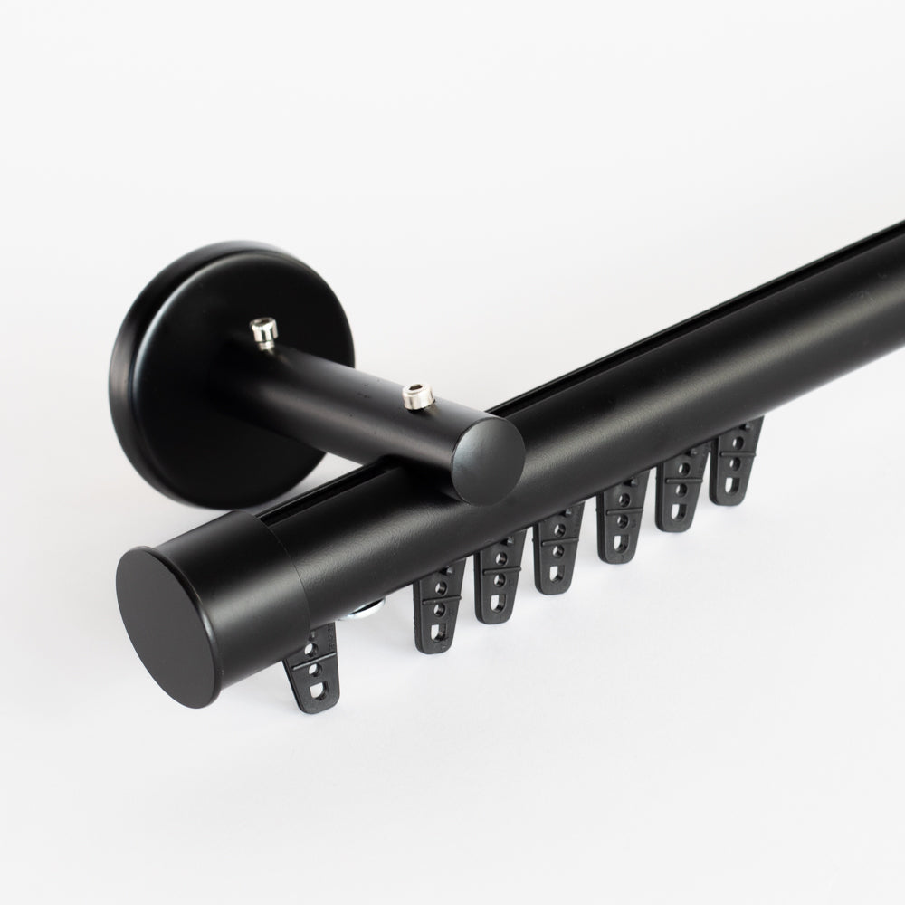 This listing is for 1 black metal wall bracket that holds a 1 1/8" diameter channel track rod (it is not compatible with a standard drapery rod). Our channel track drapery hardware is a sleek and contemporary option for your drapery installation. It has improved functionality over traditional hardware with the ease of a track system and added support for wide windows or heavier window treatments.