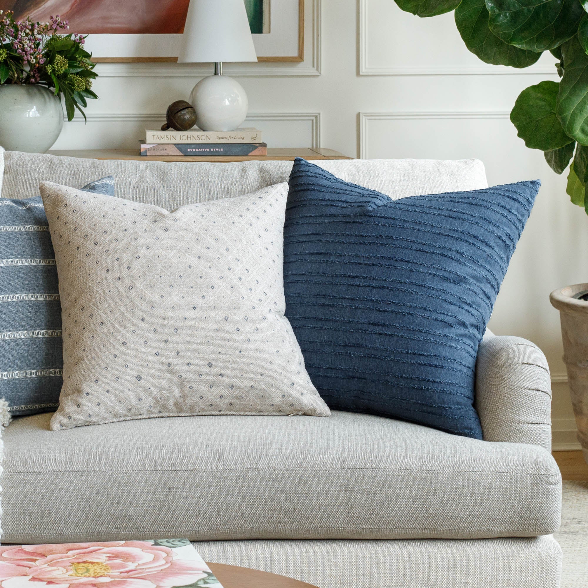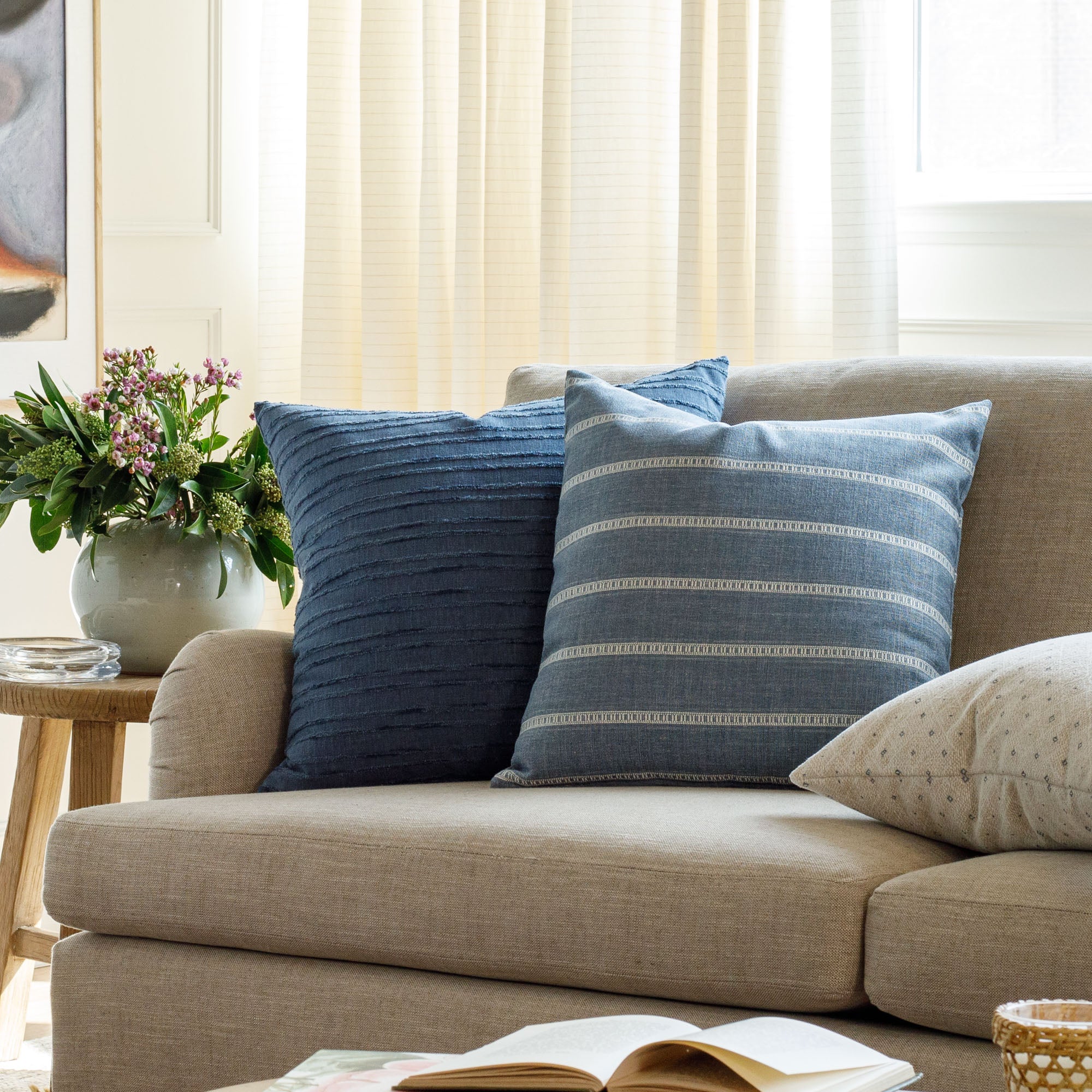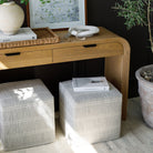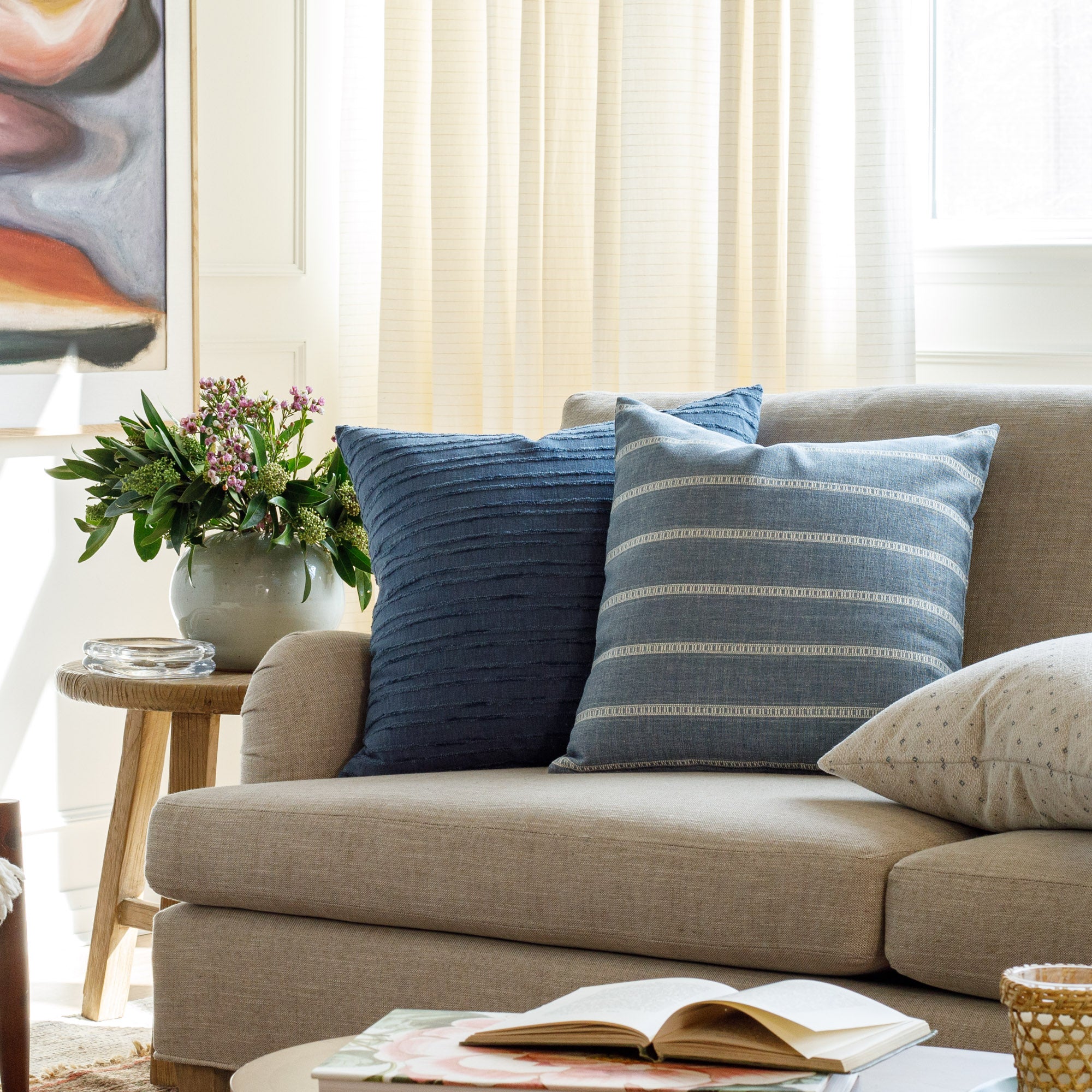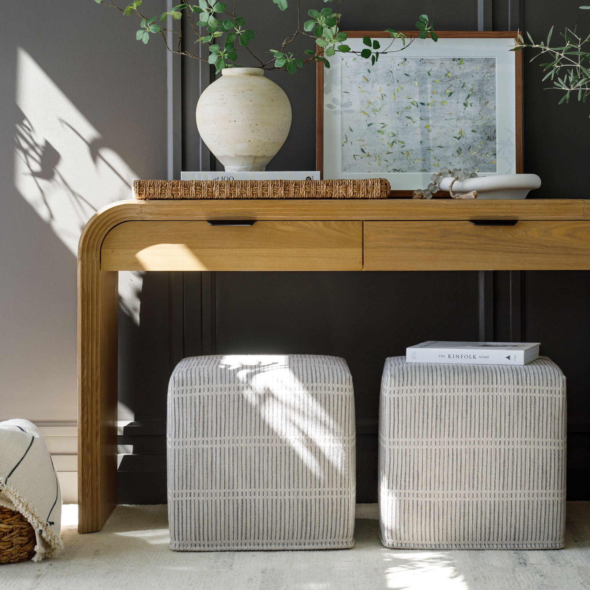 A lively dashed stripe and fresh colour palette of stone blue and greige come together to create a versatile yet eye-catching cube ottoman. It's an inviting piece that delivers an updated take on a classic pattern and will create a vibe that is organic-modern meets coastal cool.