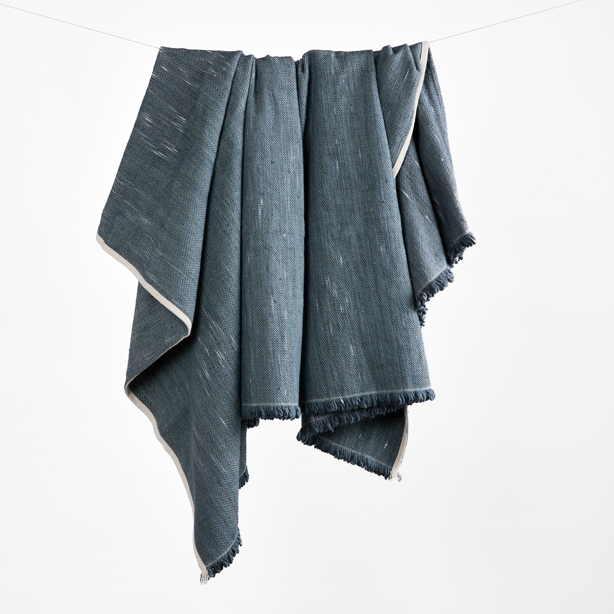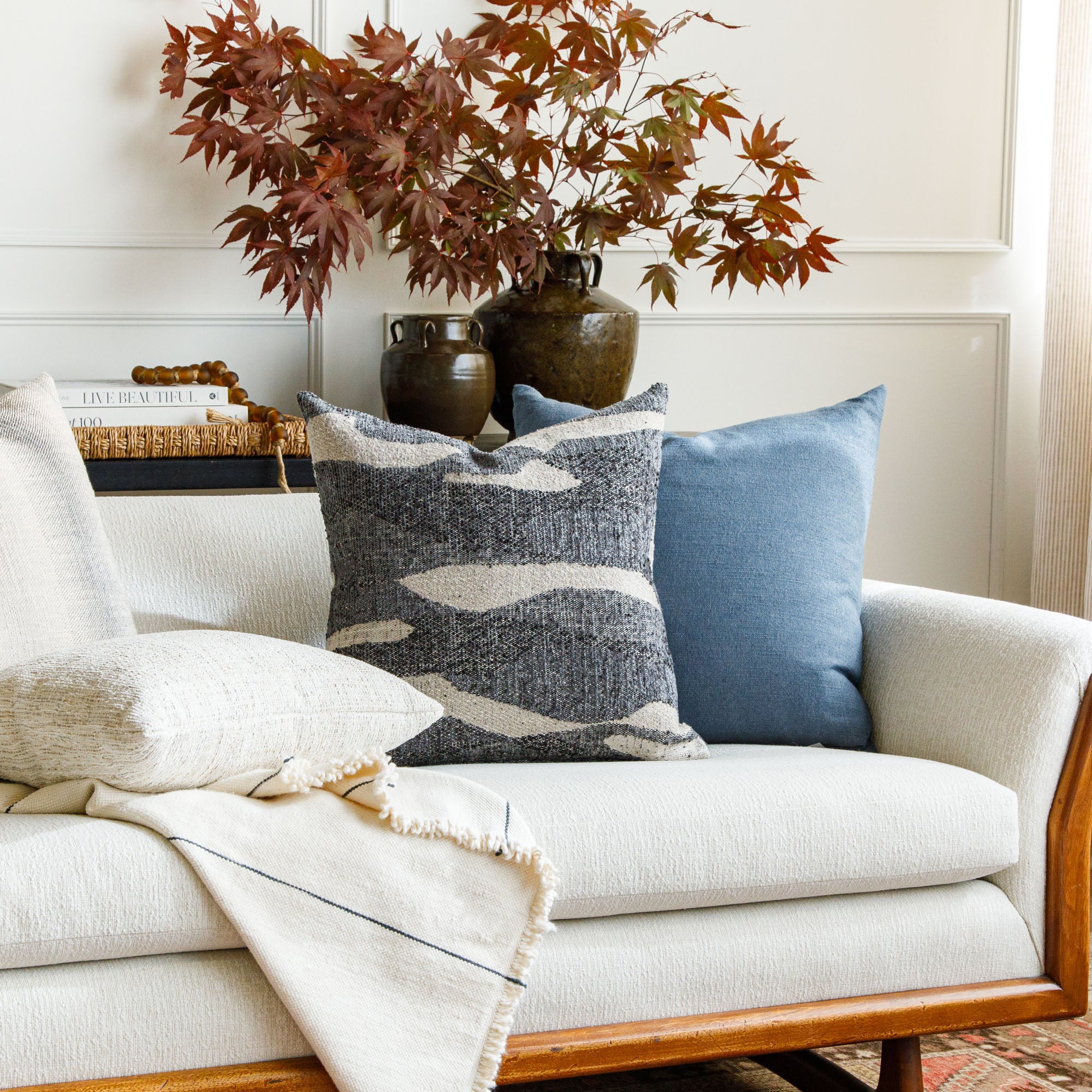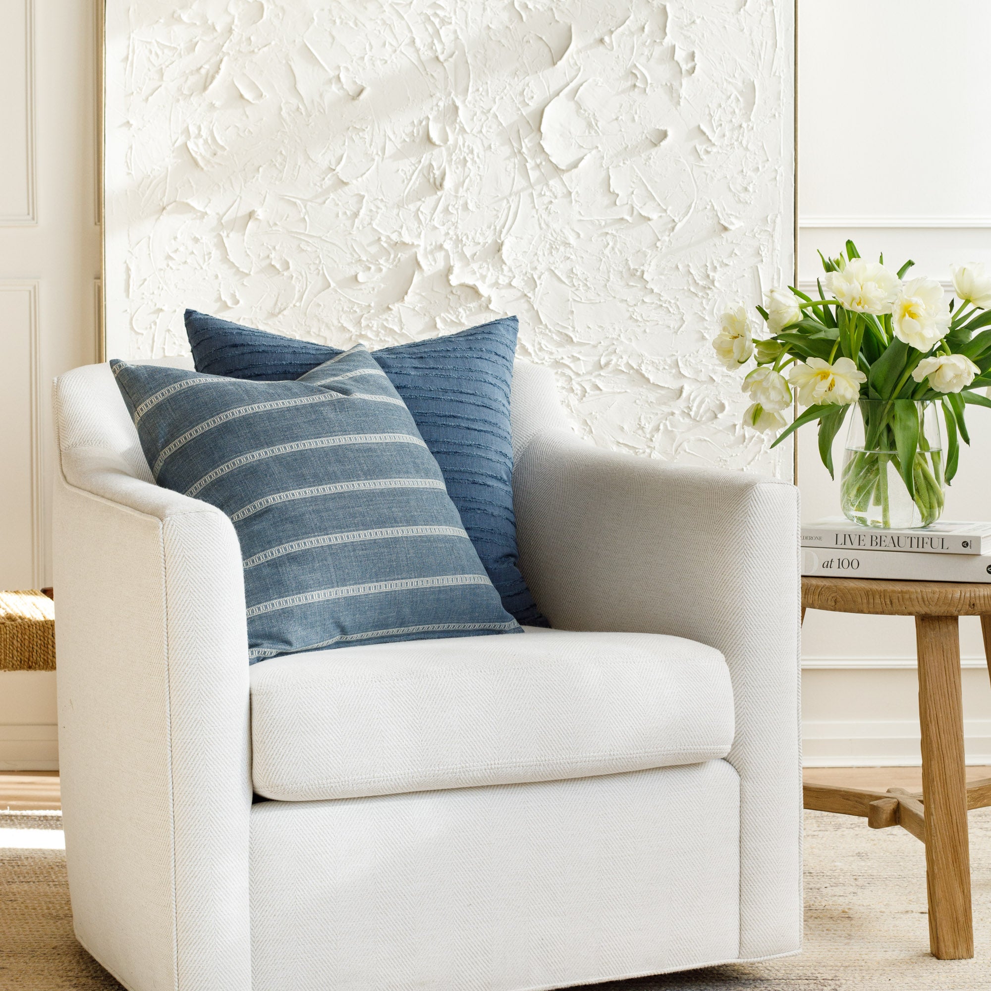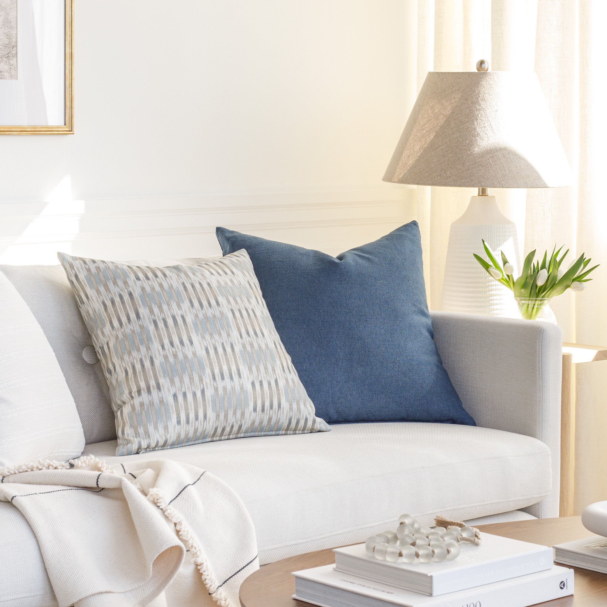 A lively dashed stripe and fresh colour palette of stone blue and greige come together to create a versatile yet eye-catching cube ottoman. It's an inviting piece that delivers an updated take on a classic pattern and will create a vibe that is organic-modern meets coastal cool.