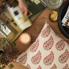 This block-print style pillow features a multicolour paisley design with punchy pink tones and delicate florals.