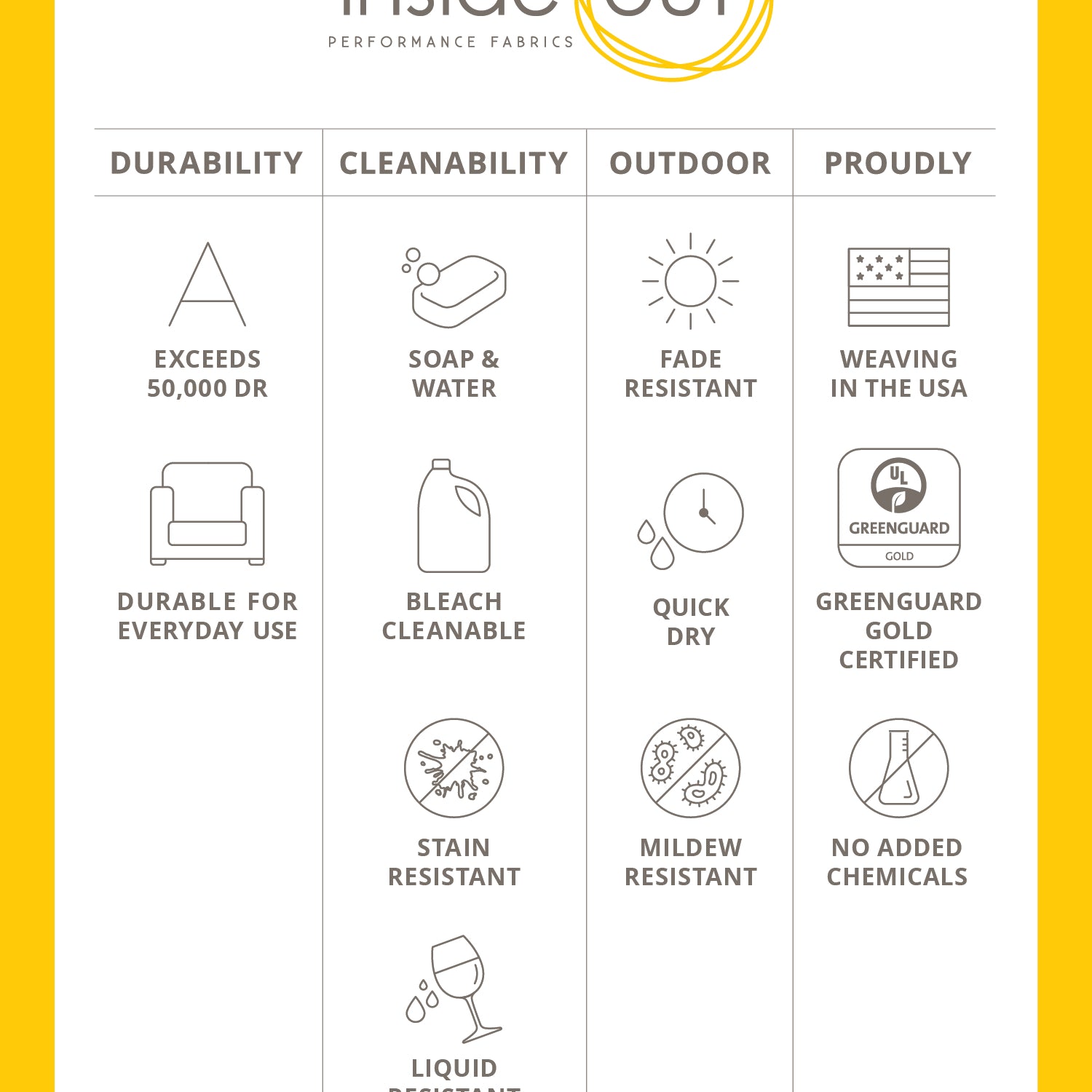 - Features: InsideOut® fabric line, soft feel, fade-resistant, stain-resistant, anti-mildew, durable, easy to clean