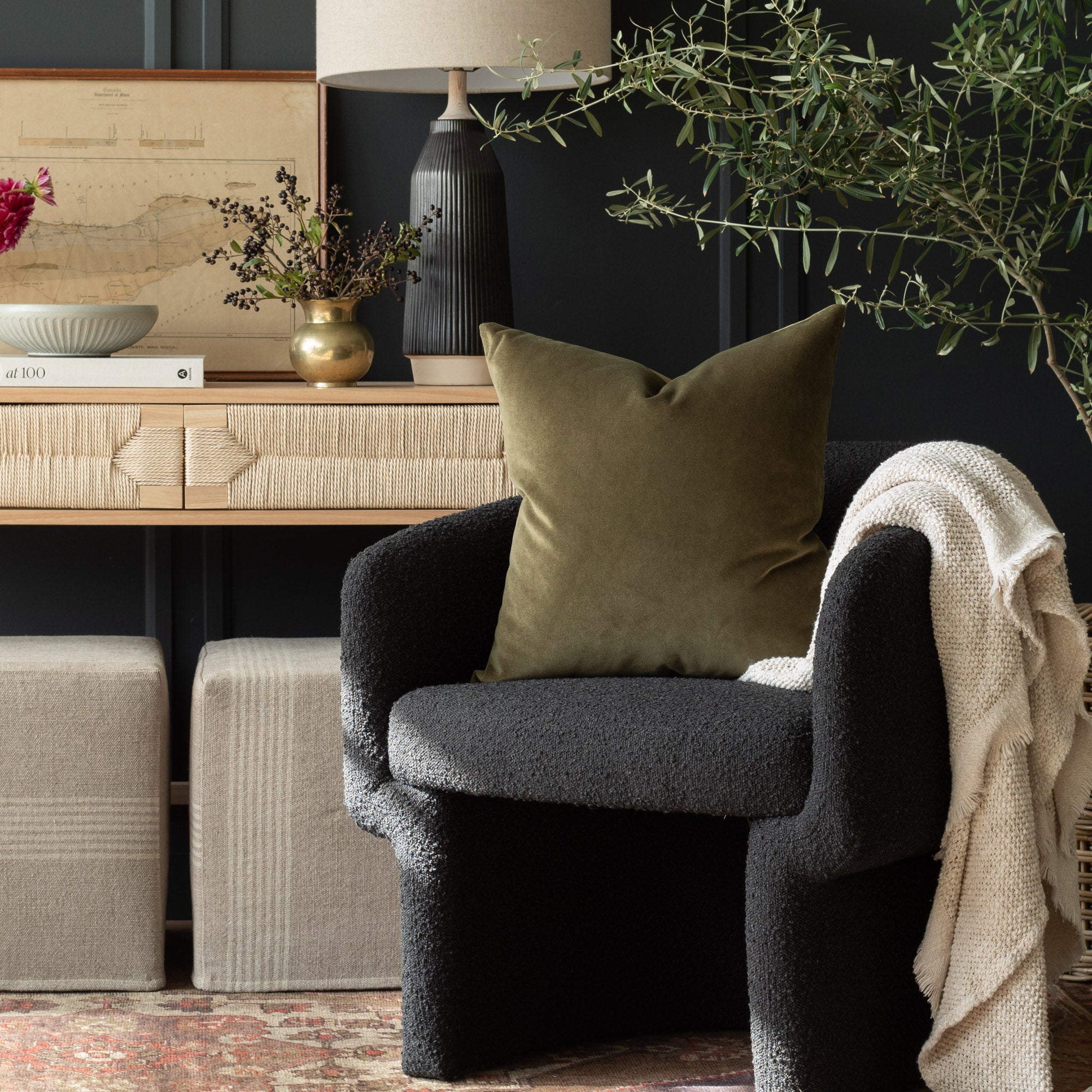 This moss green and oatmeal striped pillow showcases a simple ticking stripe with subtle vintage charm. It’s an easy-to-pair piece with a timeless and versatile look.