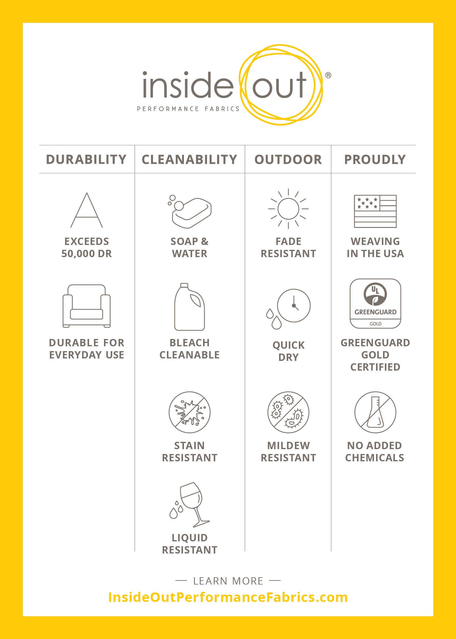- More Info: Our Inside Out fabric collection is a remarkably durable, stain resistant line that allows life to happen inside and outside! Designed to be fade resistant, stain resistant, durable, anti-mildew and easy to clean, it has the benefits of a high-performance fabric with the qualities of a durable, fade resistant outdoor fabric.