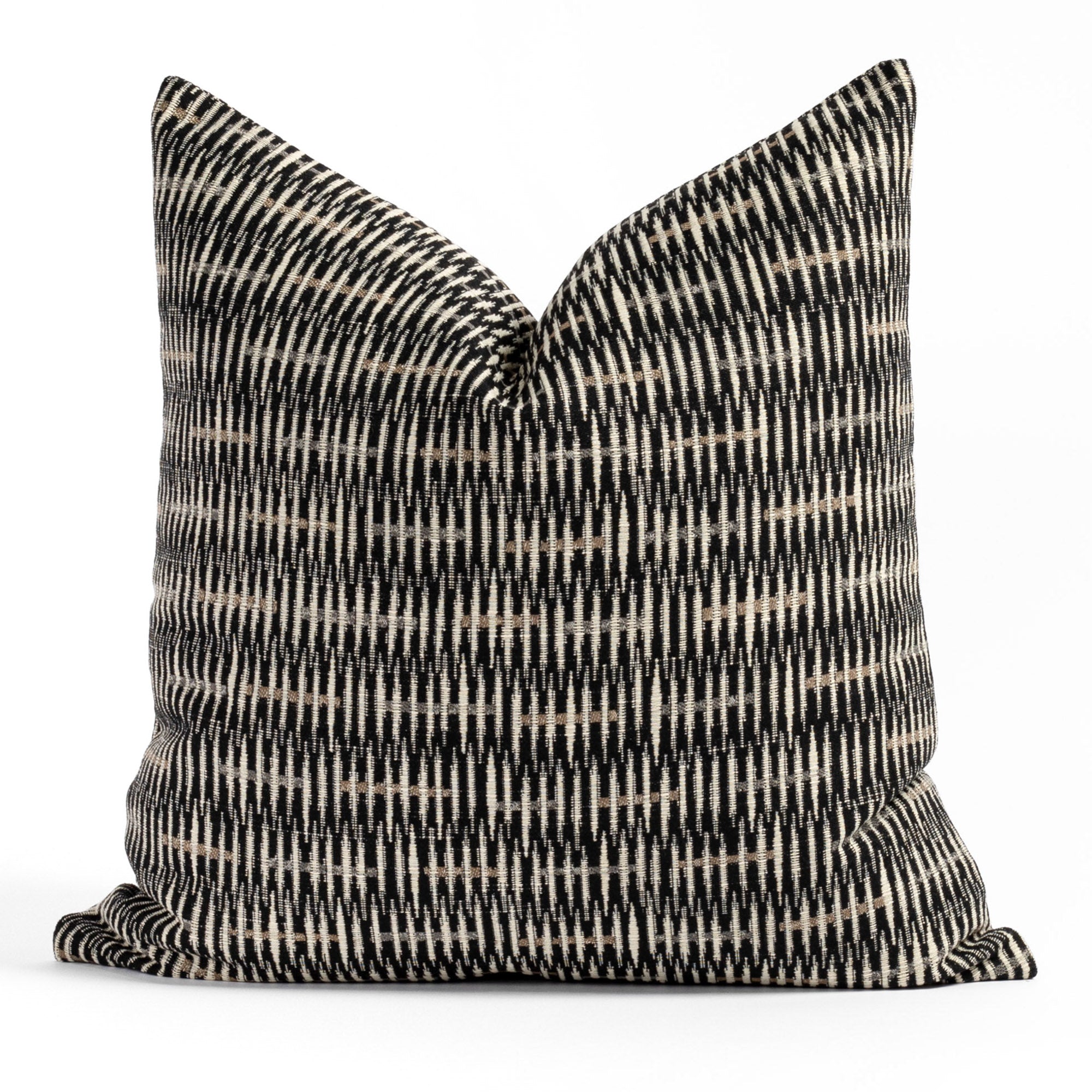 This stunning pillow weaves together tones of black, sand and tan into a modern abstract pattern. The dynamic and graphic design has an earthy, artisanal quality that will be the perfect elegant-meets-exotic addition to your pillow mix.