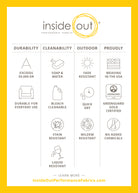 - More Info: Our Inside Out fabric collection is a remarkably durable, stain resistant line that allows life to happen inside and outside! Designed to be fade resistant, stain resistant, durable, anti-mildew and easy to clean, it has the benefits of a high-performance fabric with the qualities of a durable, fade resistant outdoor fabric.