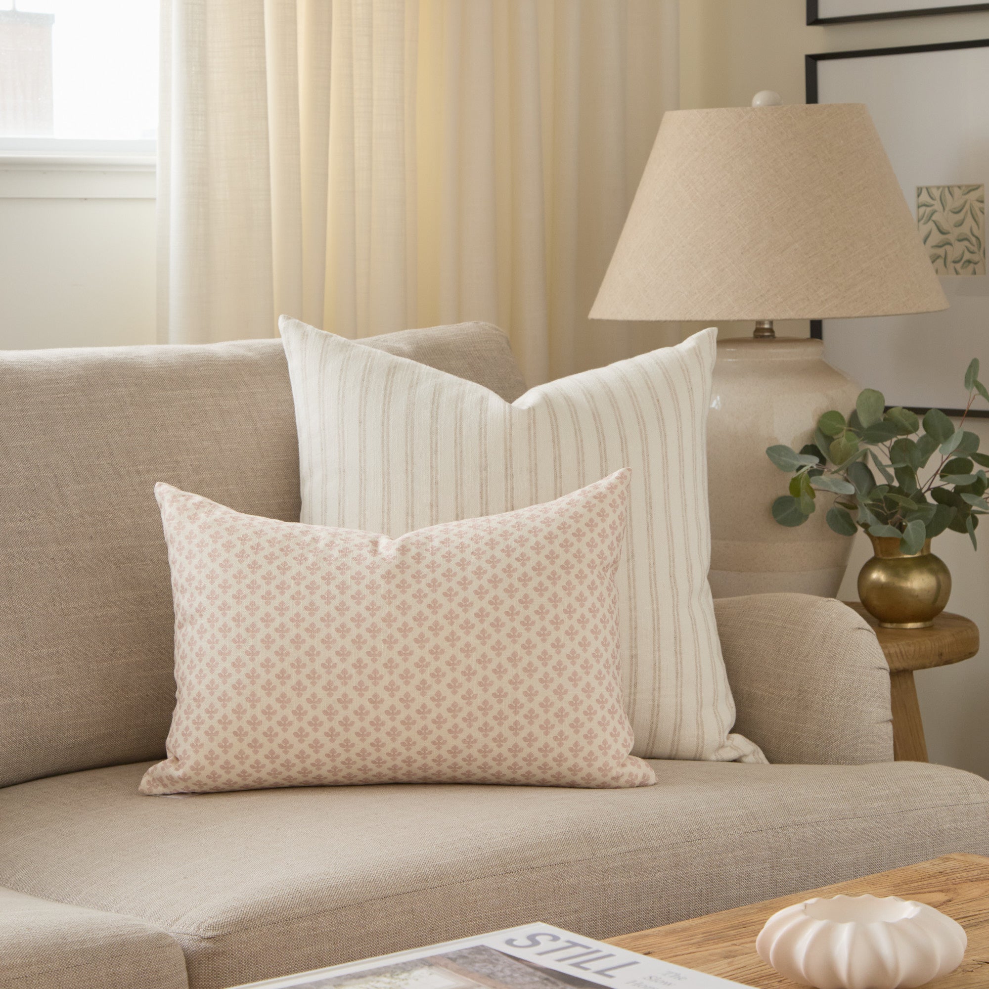 This delicate lumbar pillow showcases a petal block print in a cream and soft pink palette. It will add the perfect pop of pattern and a dose of chic, country charm.