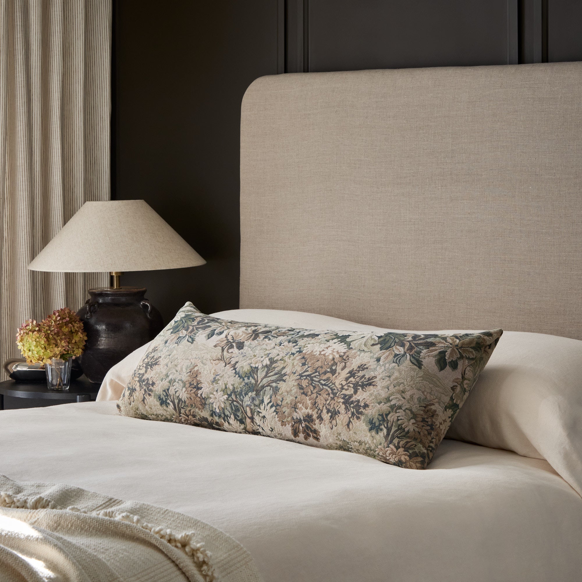 This tapestry-inspired bed bolster pillow showcases a romantic forest scene in soft, natural tones. The faded greens and browns, paired with the large-scale woven design, give it a timeless heritage quality.