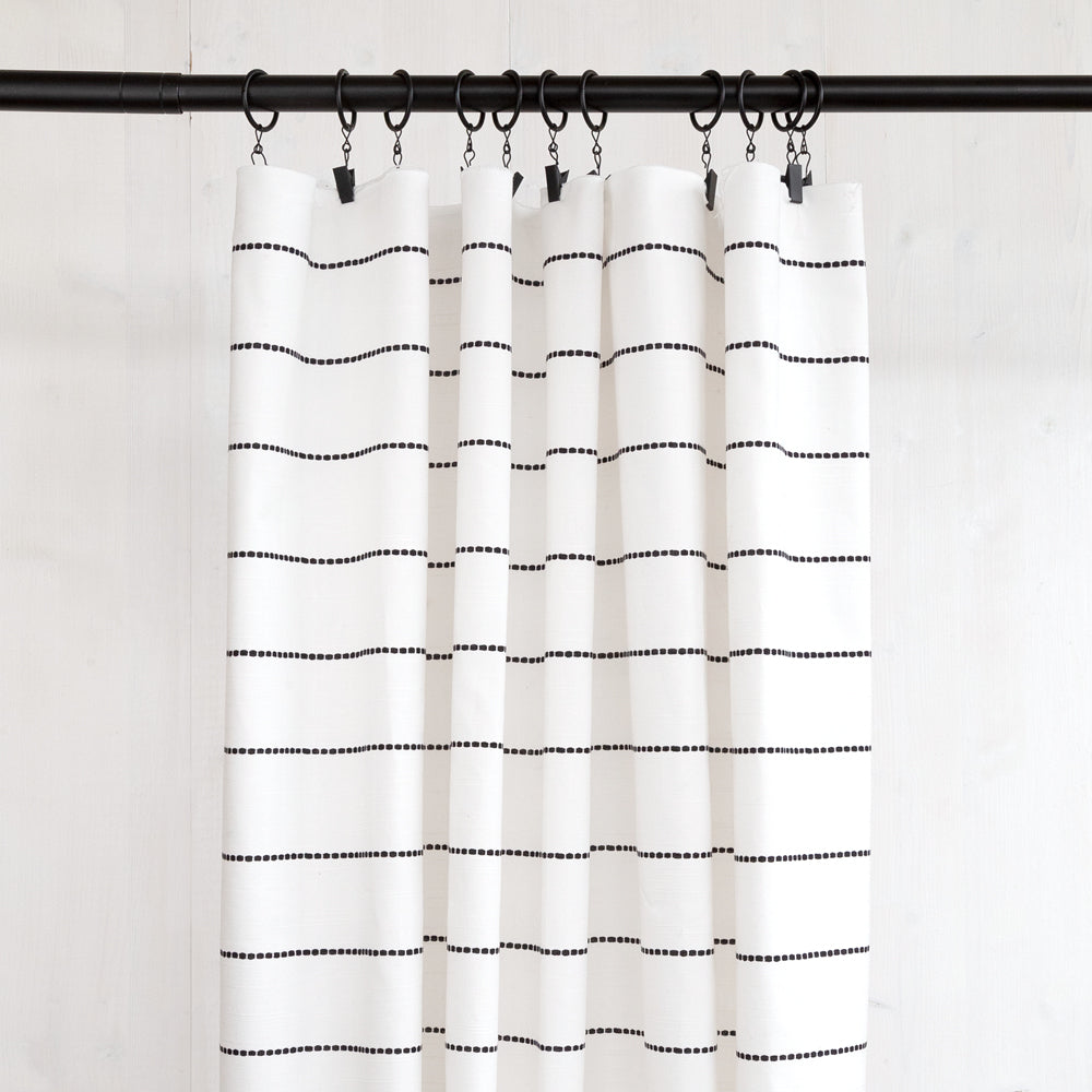 A classic, horizontal striped drapery fabric in white and black. We have a best selling upholstery fabric, Toulouse, Onyx, that we wanted to make available for you in a window treatment weight option so here it is! A perfectly drape-able cotton that has a subtle bit of textured slub woven in.