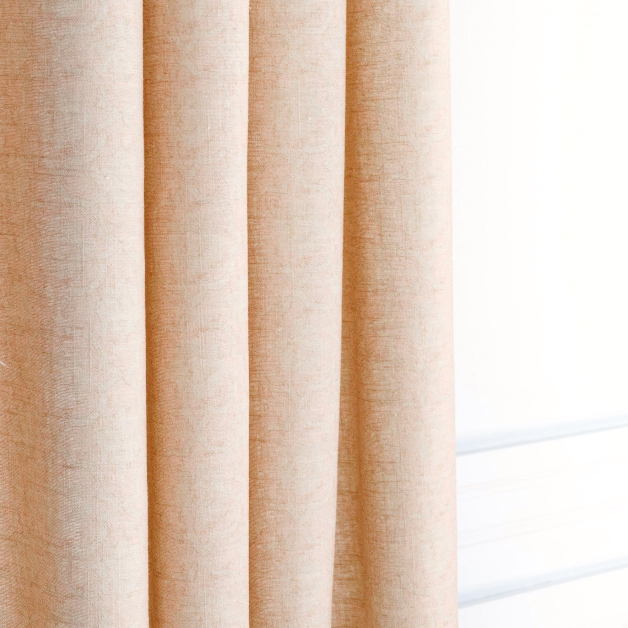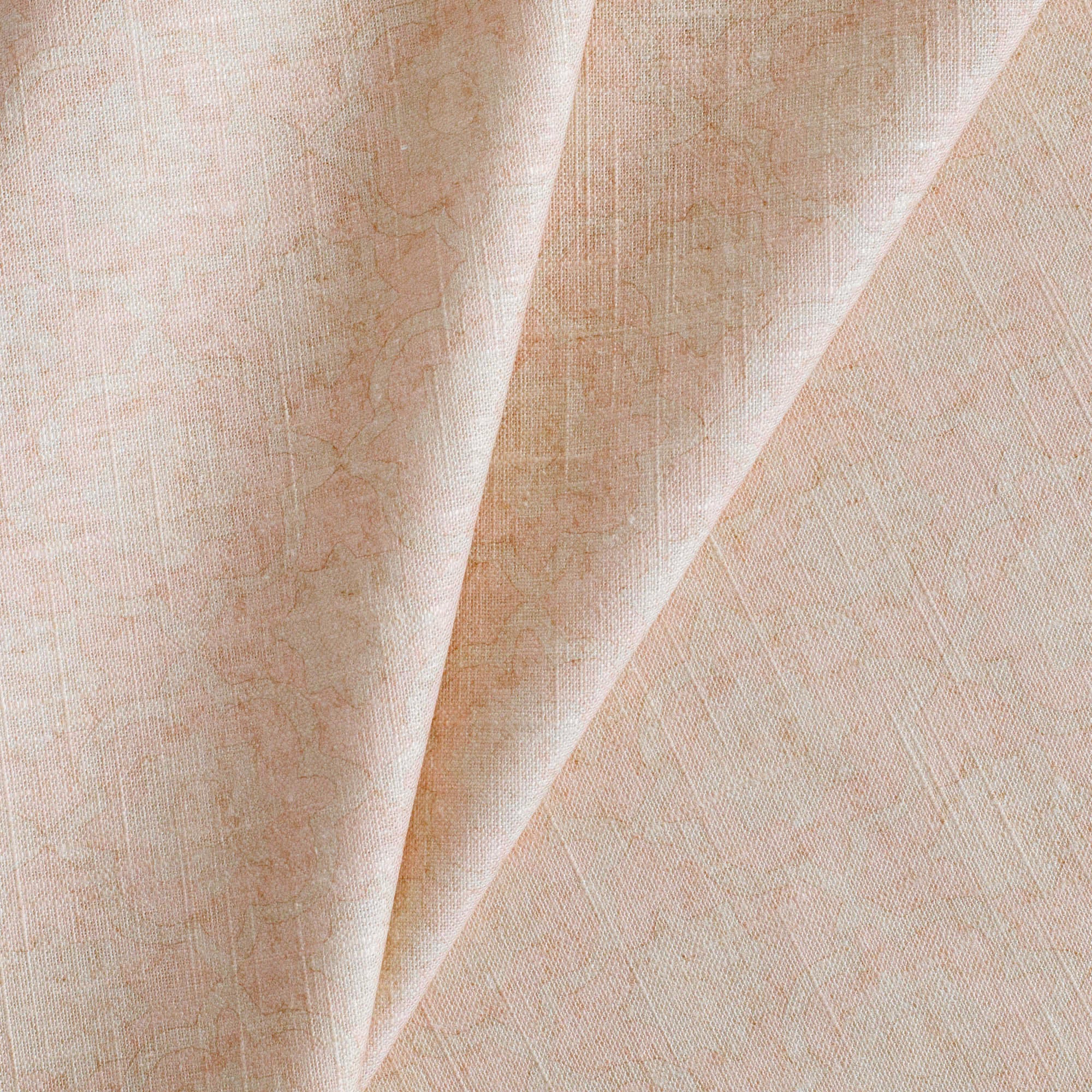 This linen-blend drapery fabric is a wash of blush pink beauty. While it may appear as a solid toned fabric, there is a subtle medallion pattern with a hand-blocked look, which creates beautiful depth and interest. With a soft drape and fine slubby texture this material would create a beautiful window treatment, creating a layer of youthful yet sophisticated style.