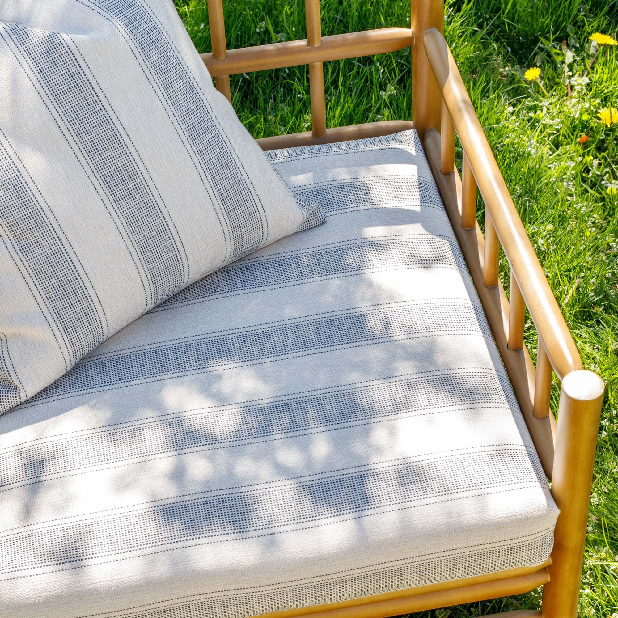 Bring life to patio furniture with this denim blue outdoor fabric. Like your favourite pair of jeans, it can function as a neutral and pairs perfectly with just about anything — and looks especially great with white.