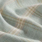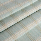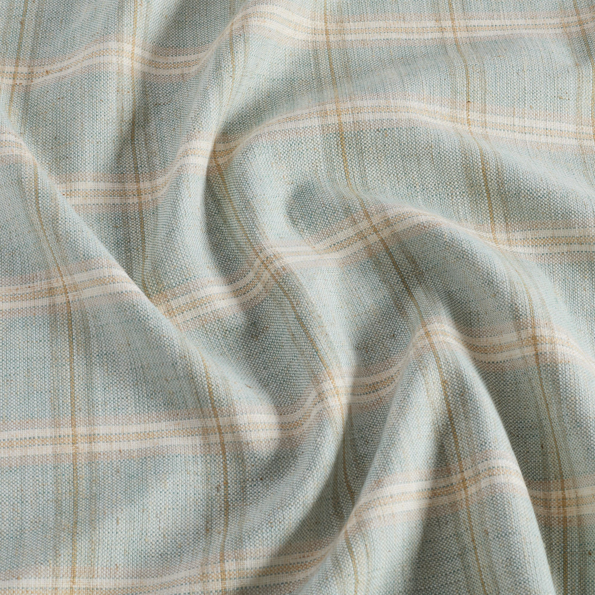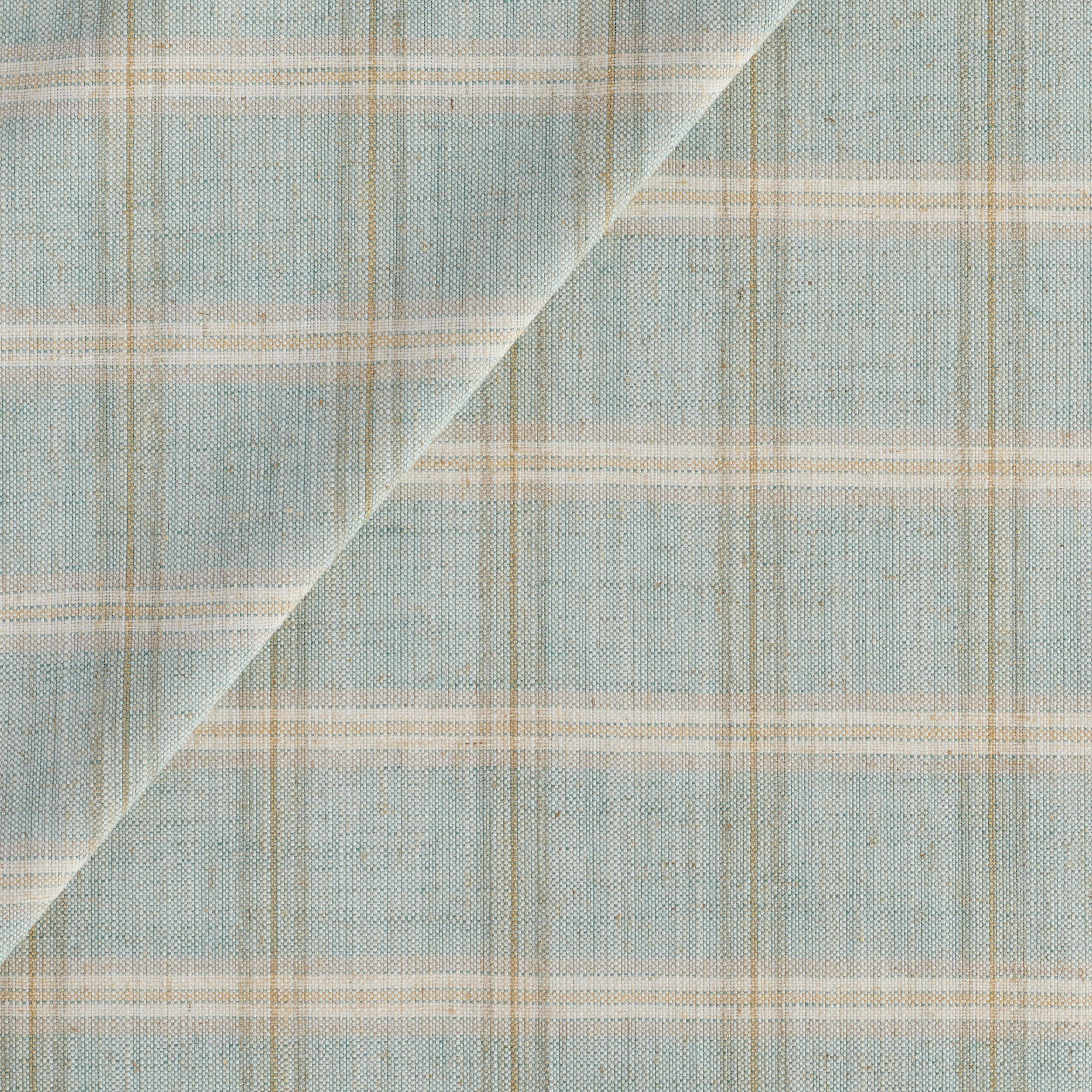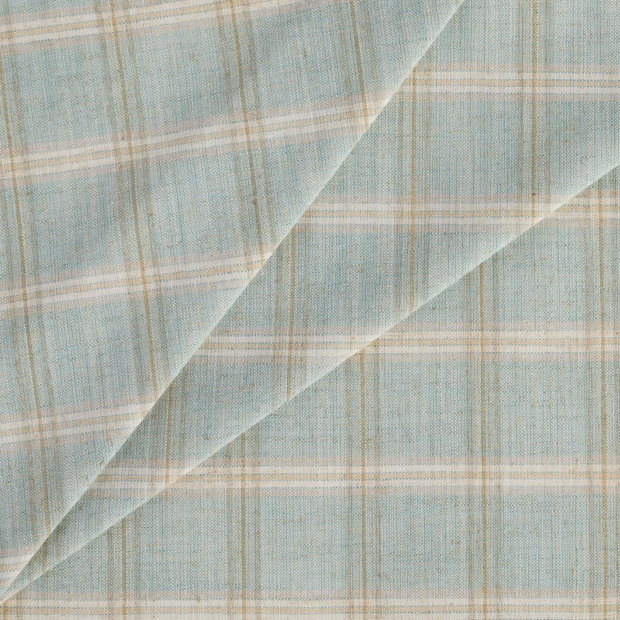 We can almost feel the sunshine and salty air on our faces when looking at this breezy summer plaid. Duck egg blue and sandy beige mingle with creamy white and pale straw gold to create this preppy casual check.