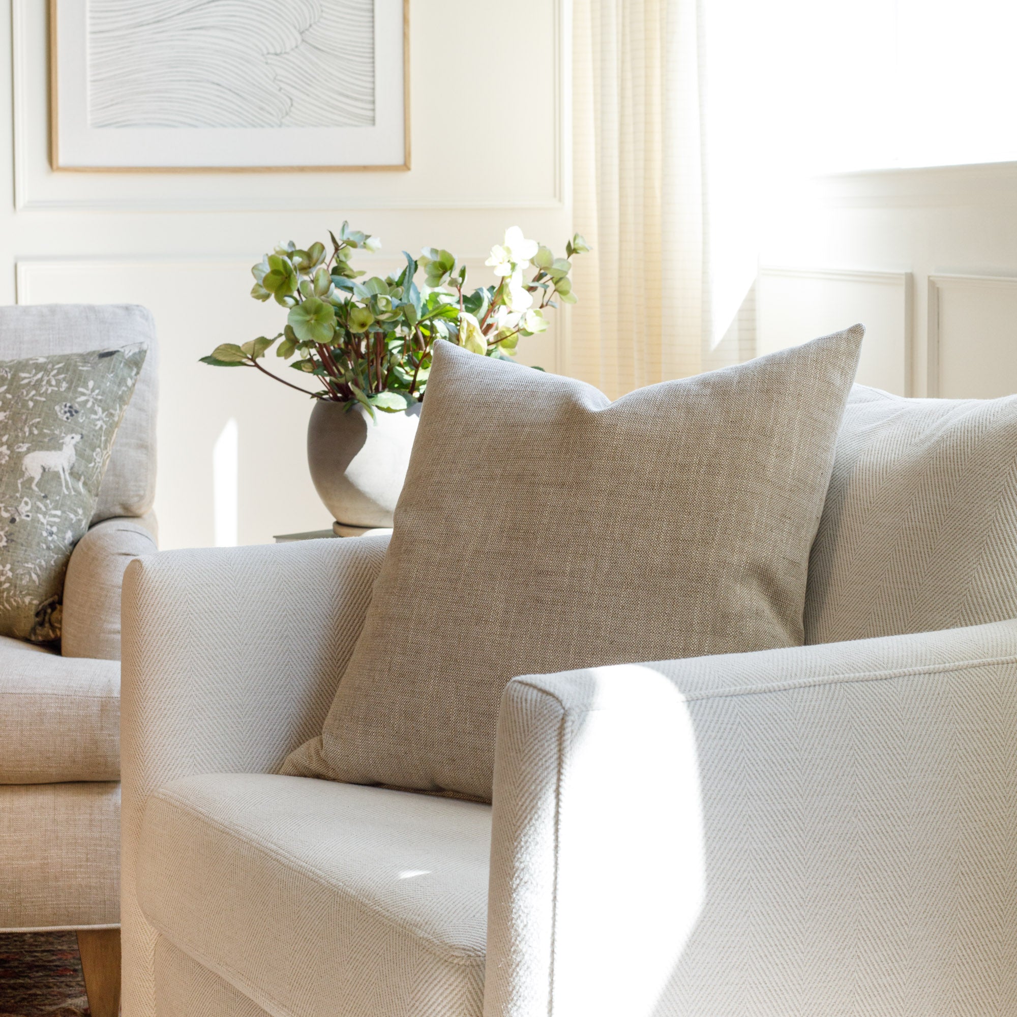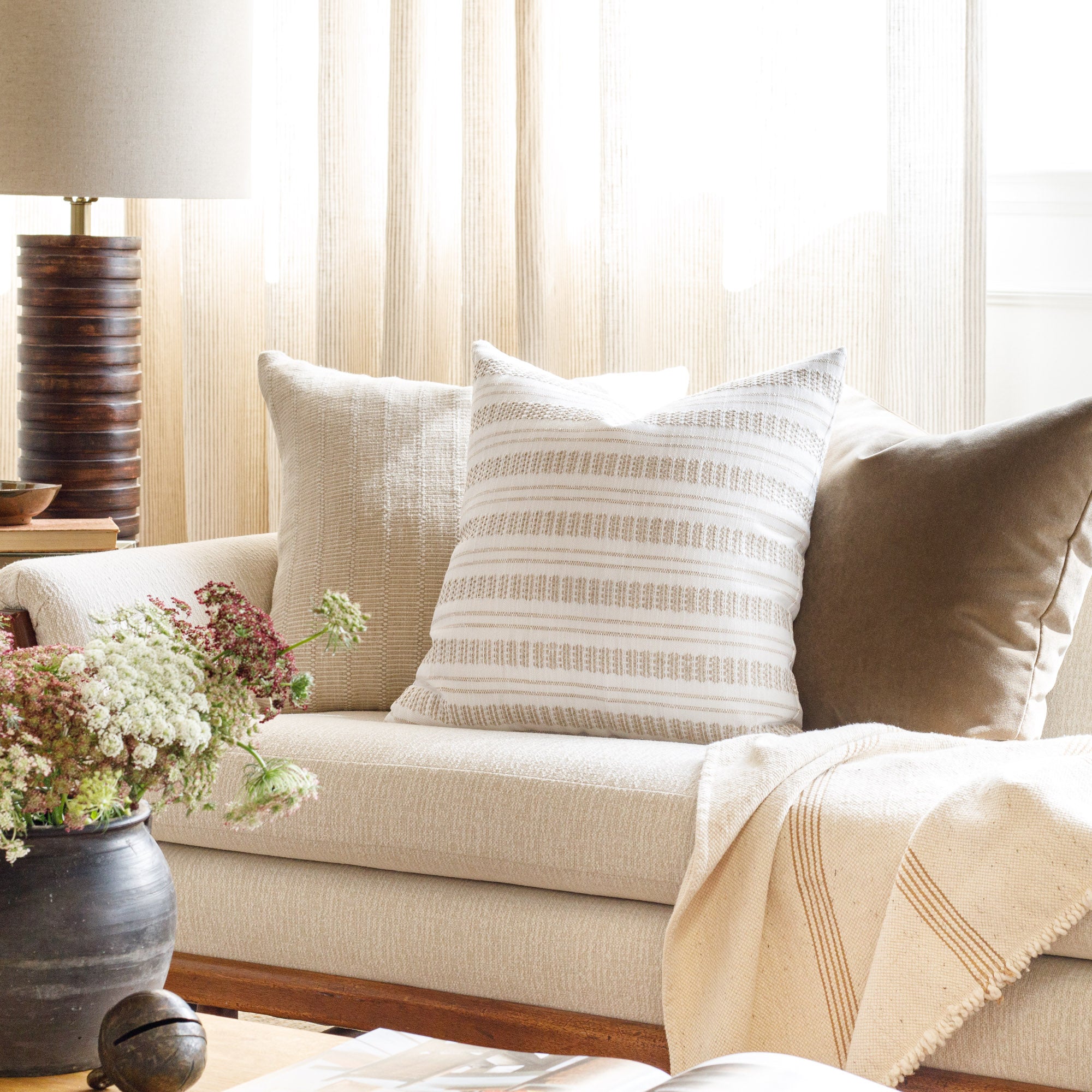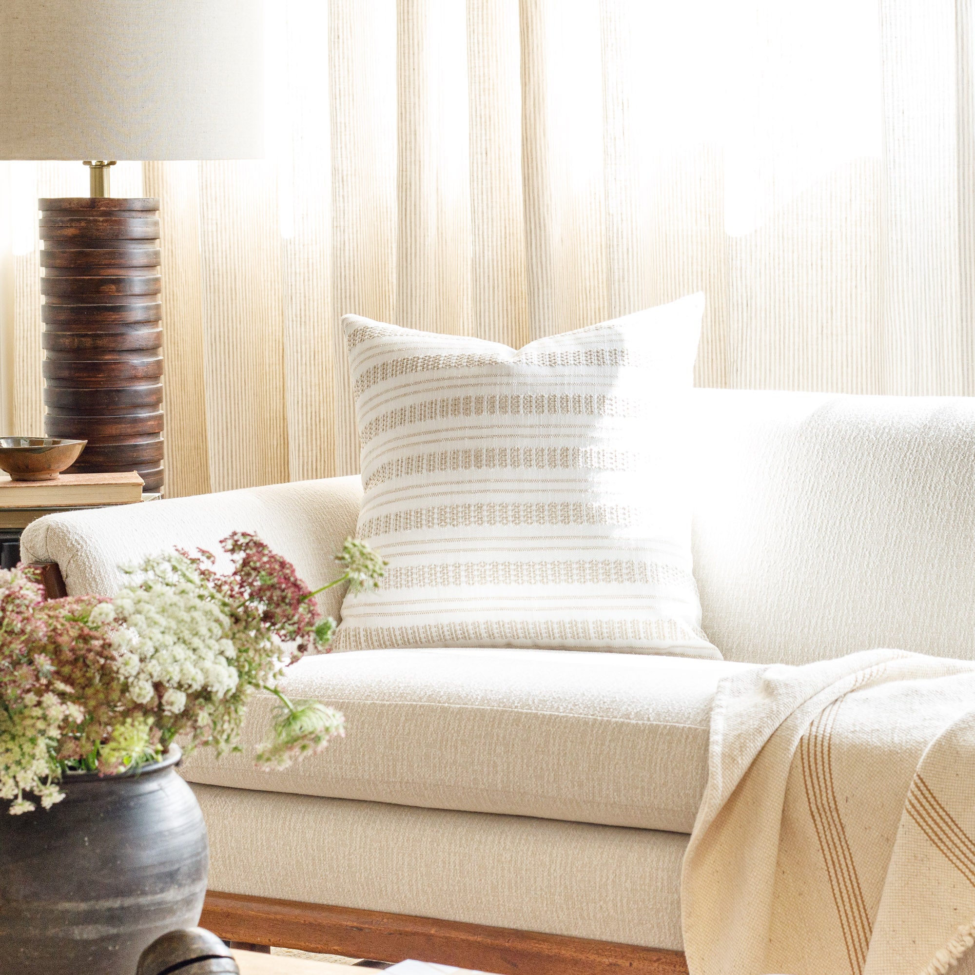 This casual striped pillow in a a dusty, sage-green and oatmeal colour palette is an instant classic. With a luxe-meets-earthy aesthetic and organic texture, this highly versatile and beautiful piece effortlessly delivers a coveted Belgian farmhouse style.