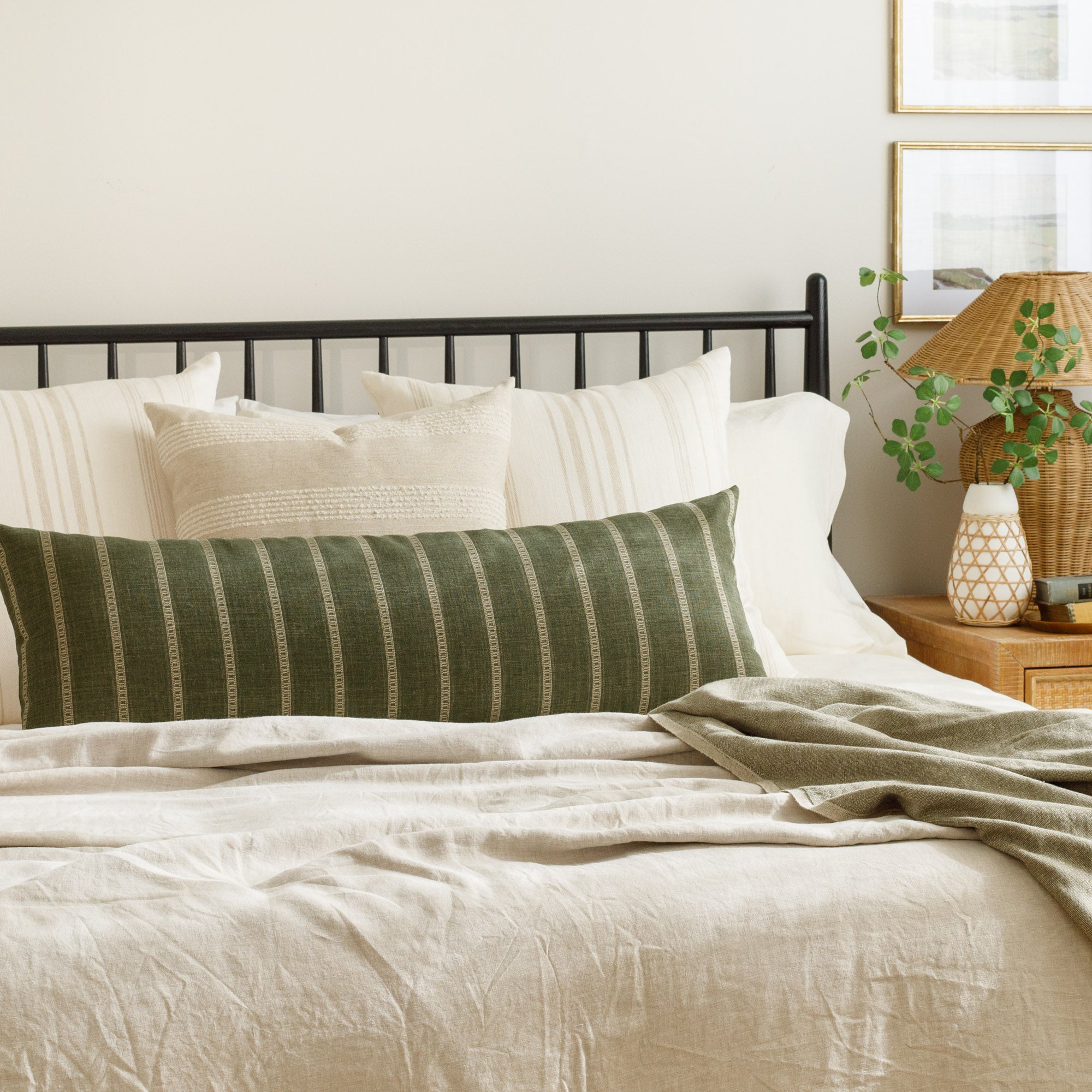 This moss green striped fabric blends eclectic charm with timeless appeal.