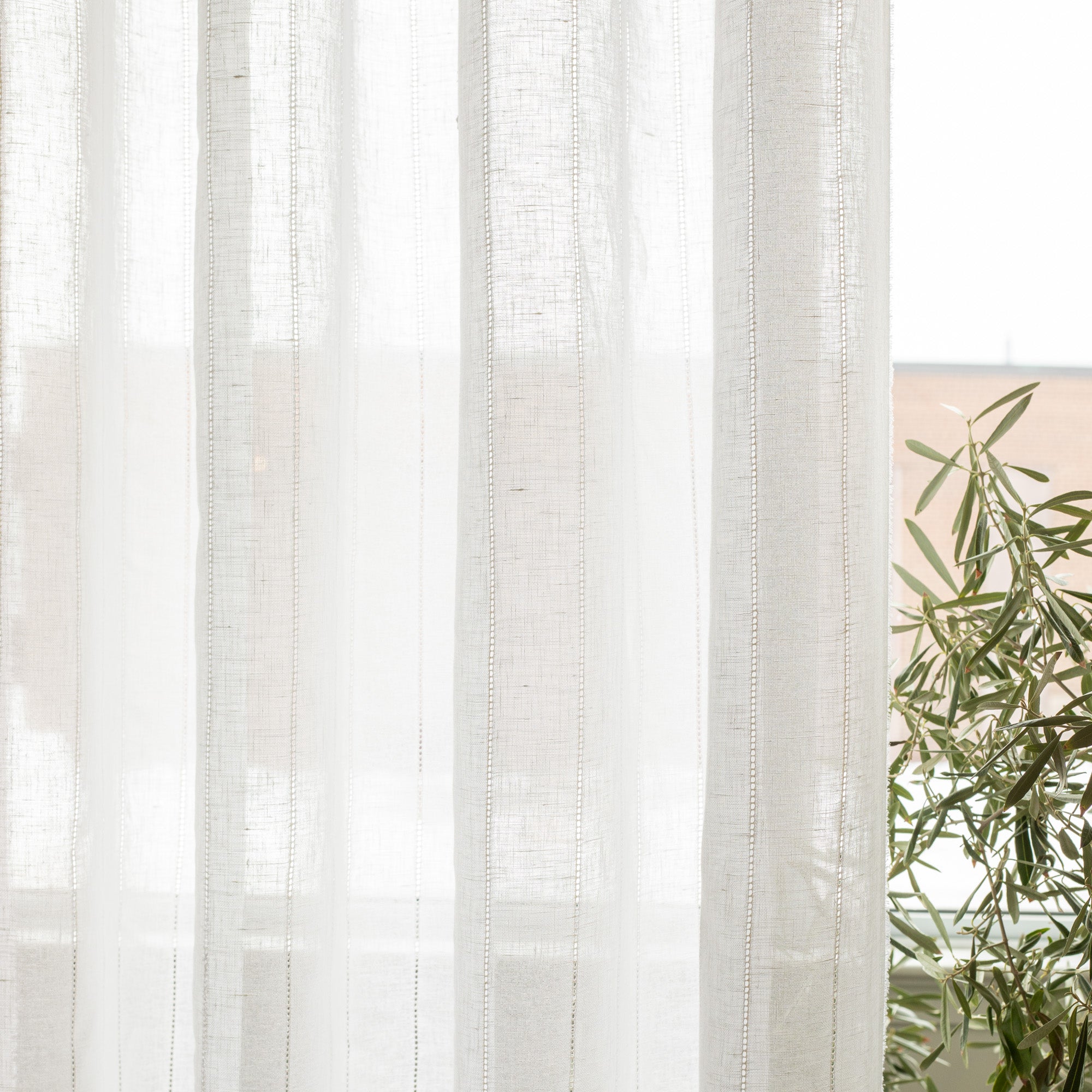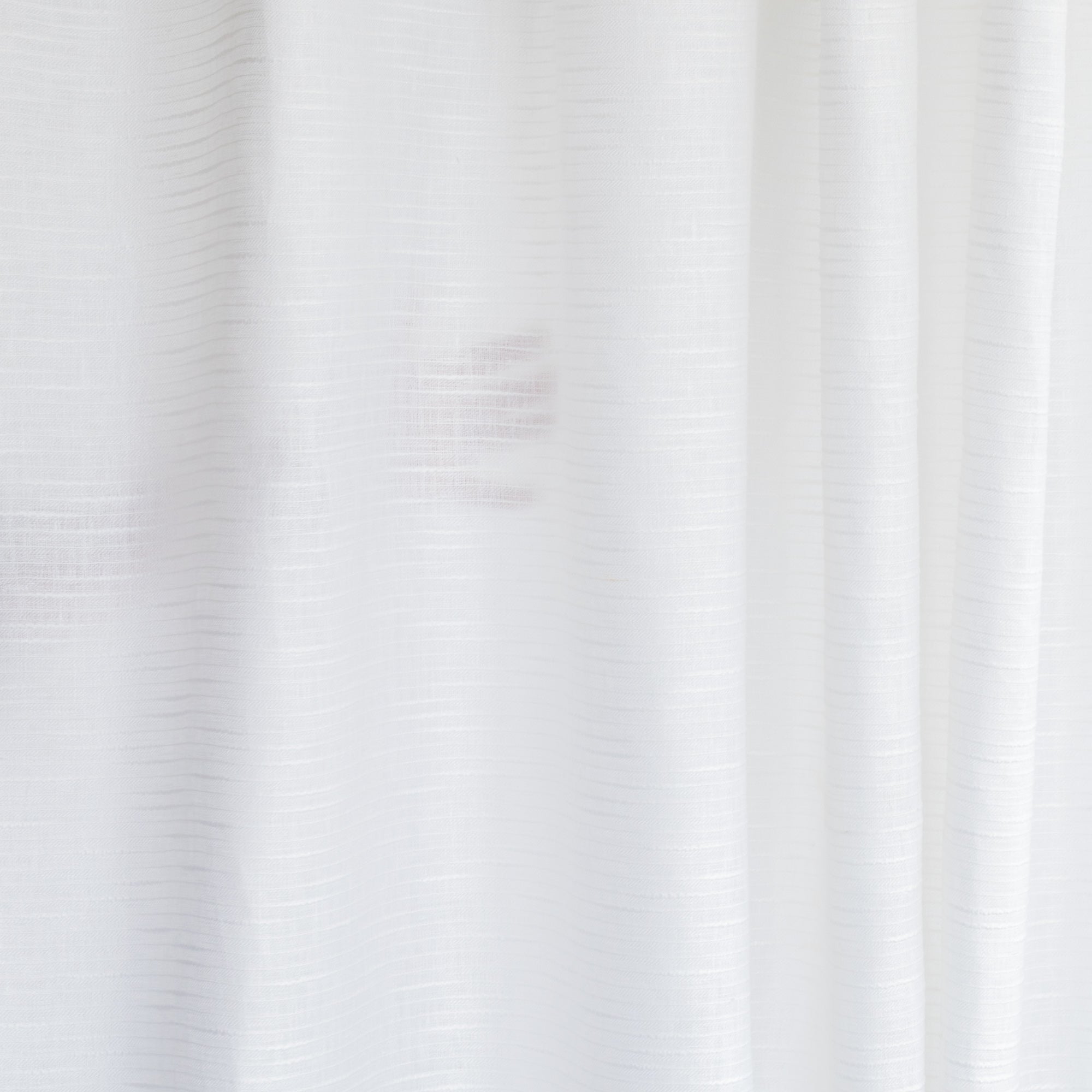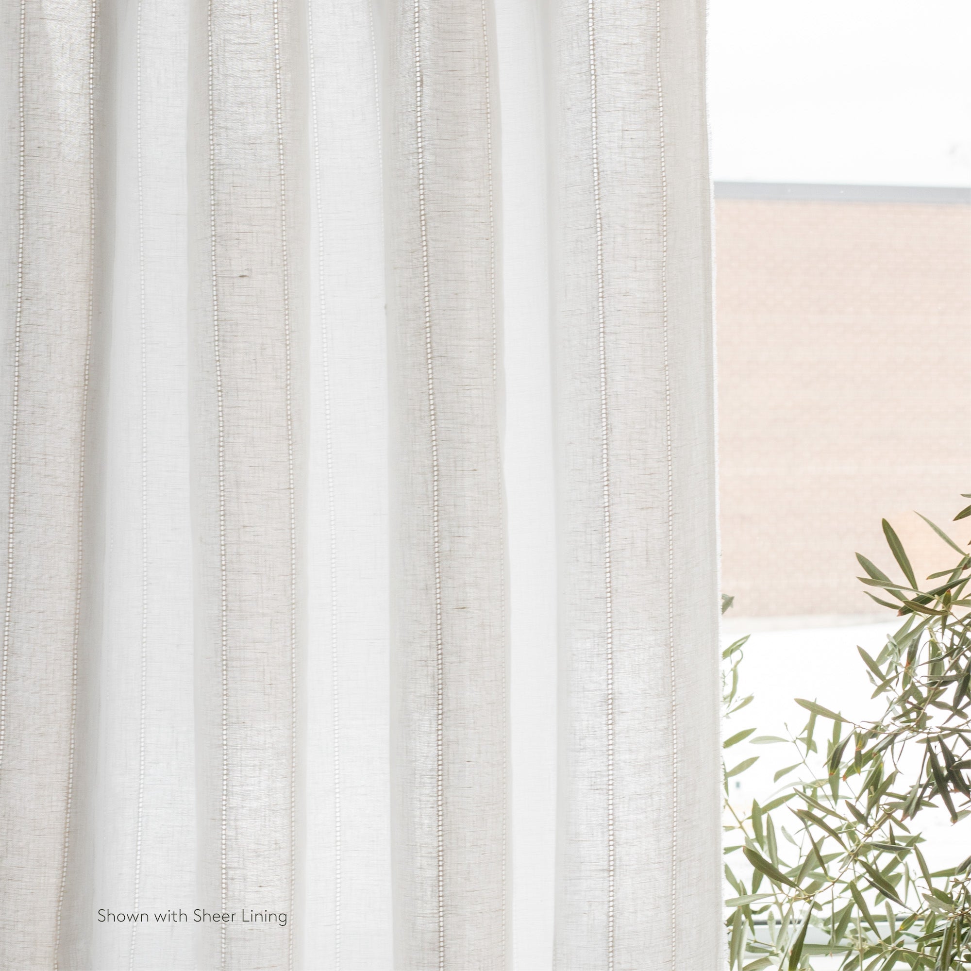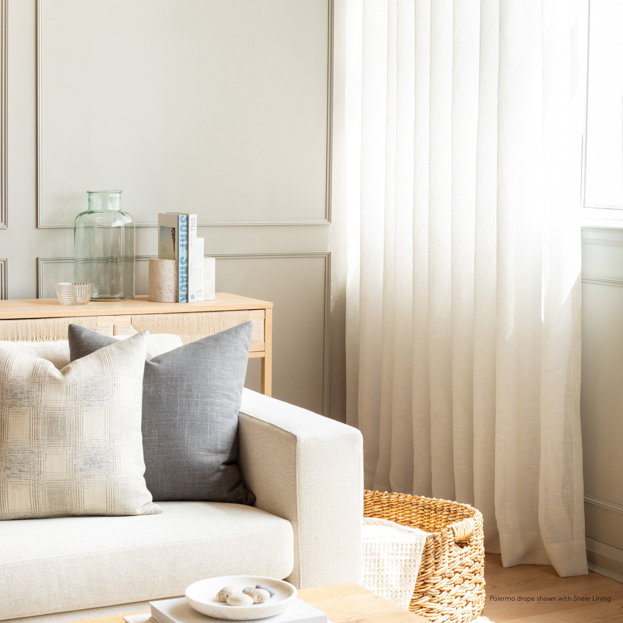 This stunning sheer linen blend fabric has a gorgeous texture that would filter light beautifully. It's perfect for sheers to pair with drapes but also as standalone curtains with a light lining.