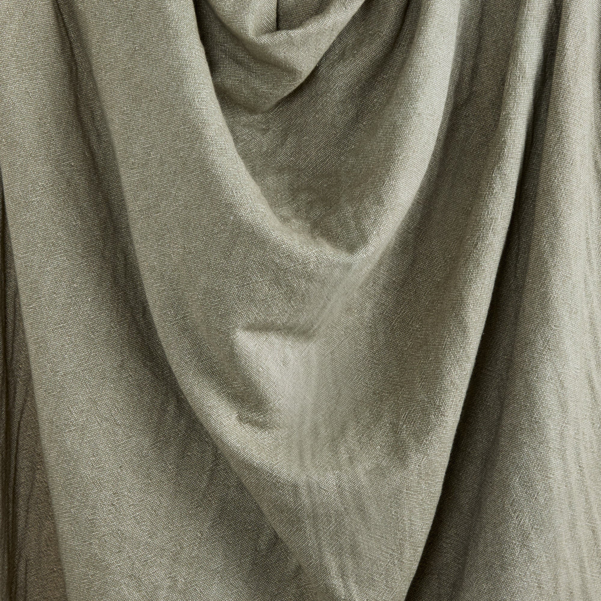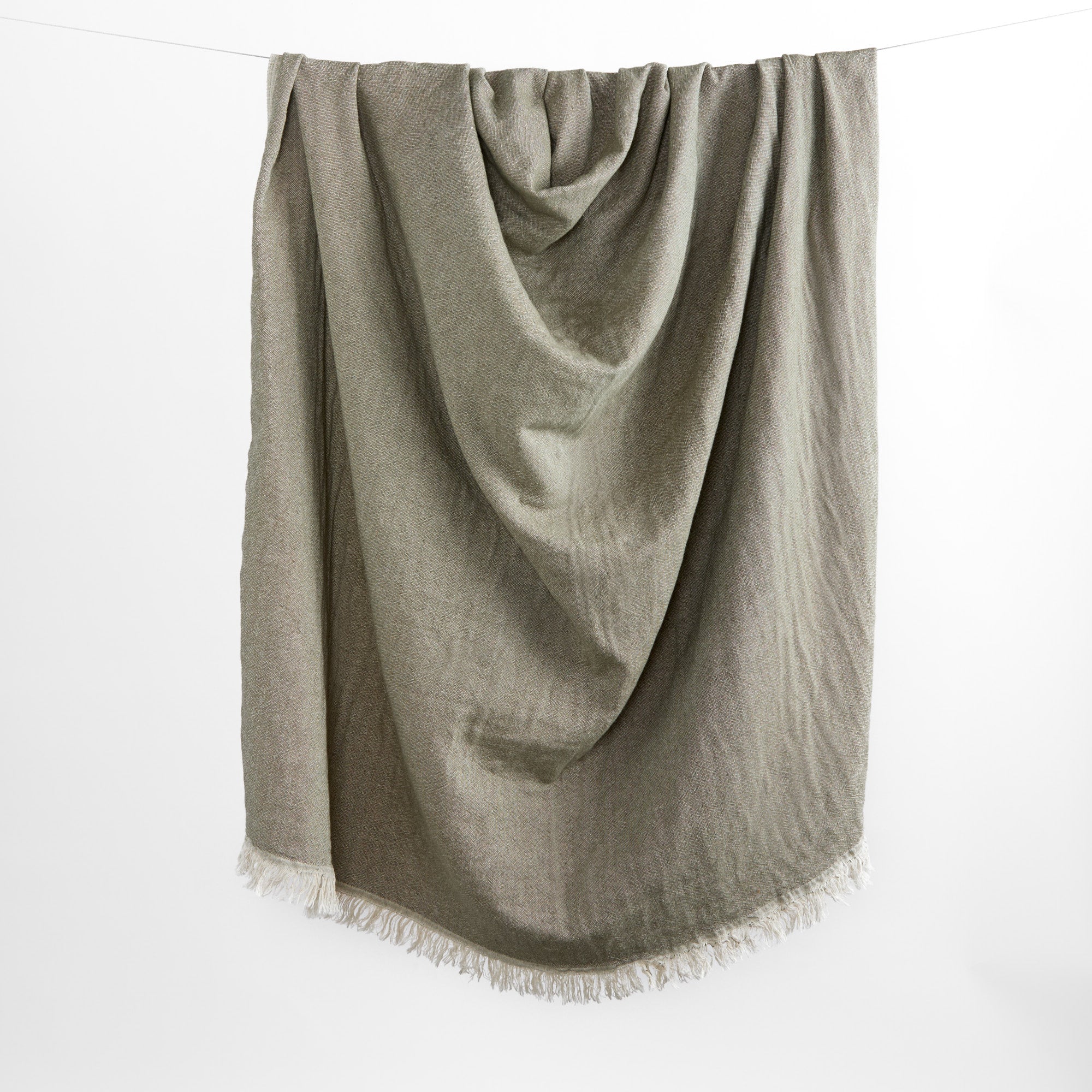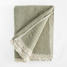 Curl up and get cozy with this earthy olive green and natural throw blanket. Crafted from a luxurious linen-cotton blend, this reversible, double-sided throw offers timeless appeal with its soft texture and perfectly balanced weight — light yet substantial. The delicate fringe detail and two-ply construction add to its understated elegance, making it a refined yet relaxed accent for any space. Whether draped over your sofa or wrapped around you on a chilly evening, this versatile throw brings a touch of organic warmth to your seasonal décor.