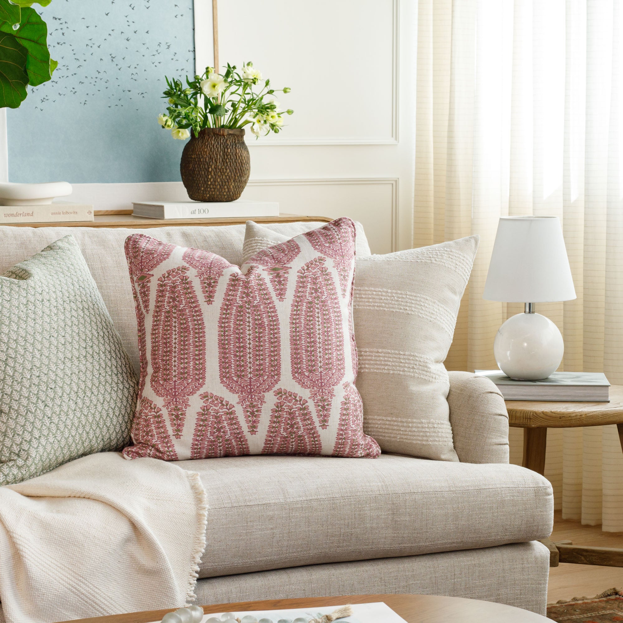 The warm white and fresh green floral block print gives this pillow a touch of handcrafted charm.