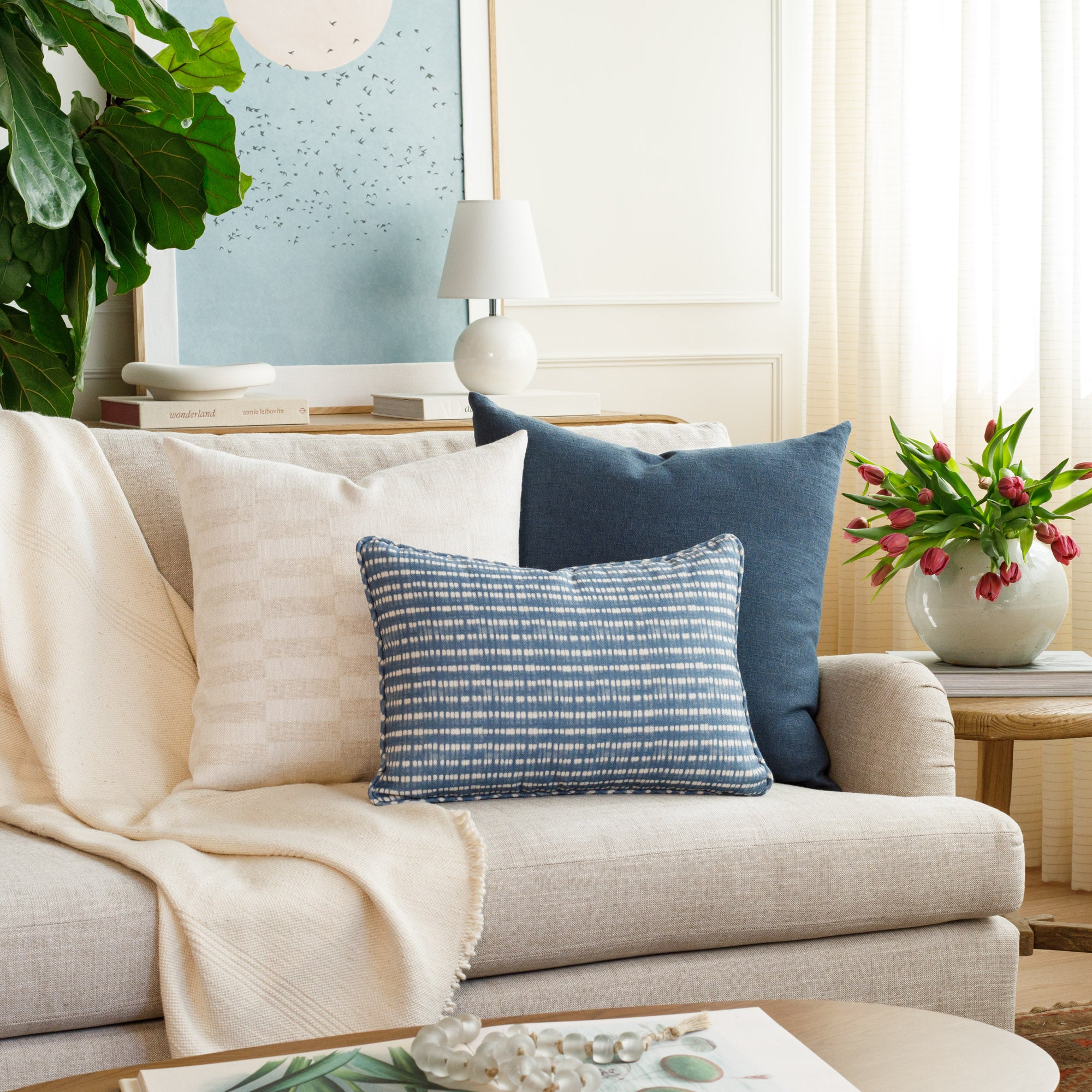A beautiful sky blue and white striped pillow with casual coastal charm. The woven stripes have flecks of beige, offering warmth to this stain-resistant pillow's fresh ivory background.