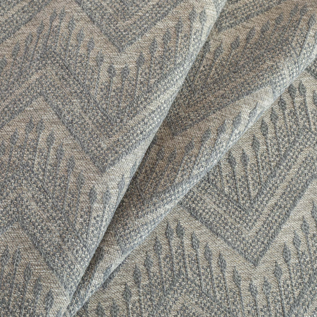 This multipurpose upholstery fabric combines an earthy grey, slubby background with a faded denim blue in a woven pattern that melds chevron and tassel-like motifs. Offering a global style that is both sophisticated and exotic, this textured material has beautiful depth and character that is sure to make a statement.