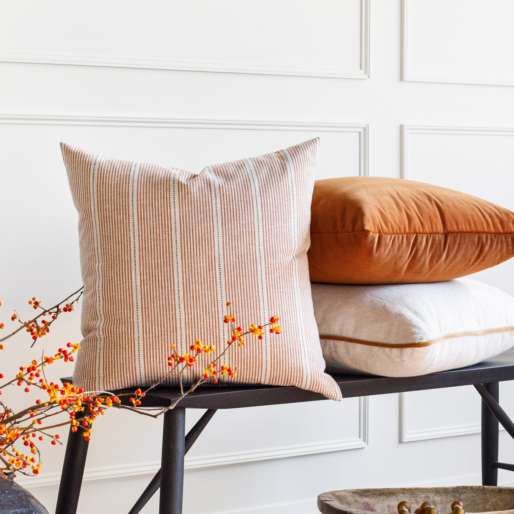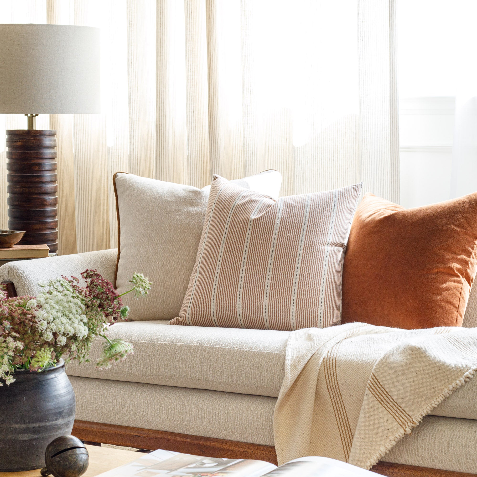 This rusty, burnt orange velvet lumbar pillow is luxurious and super soft. Like a well-aged glass of cognac it's full bodied and will instantly add richness to your space. The versatile tone pairs well with a range of colour palettes from deep and earthy to creamy and pretty.