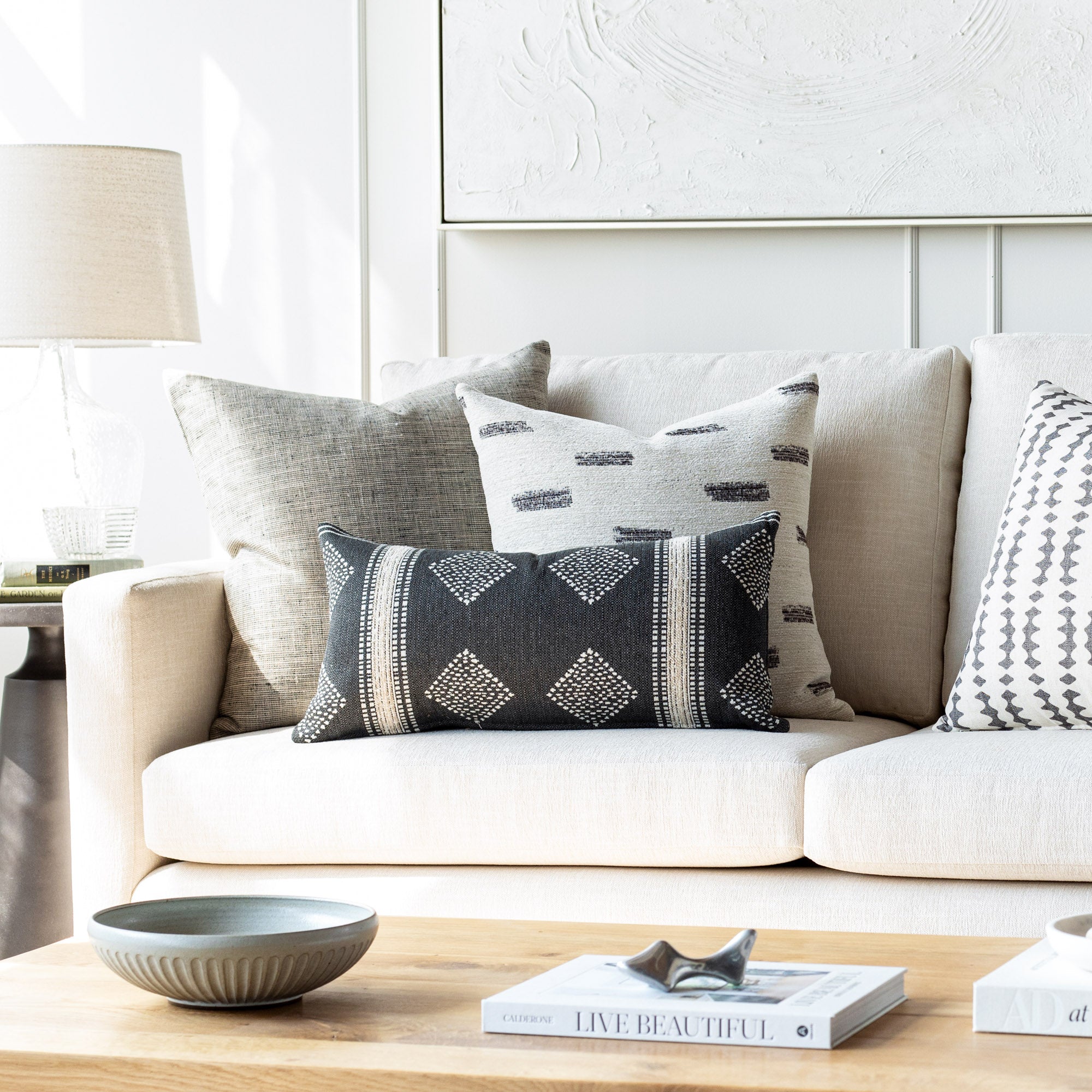 How to use: This lumbar size is extremely versatile and works perfectly placed in front of a larger bed bolster to create a simple but stylish bed pillow-scape; Or, simply place two in front of your own bed pillows for a stand-alone statement. These 12x24 lumbars also work well on larger sofas or sectionals paired with other 20x20 or 22x22 decorative pillows.